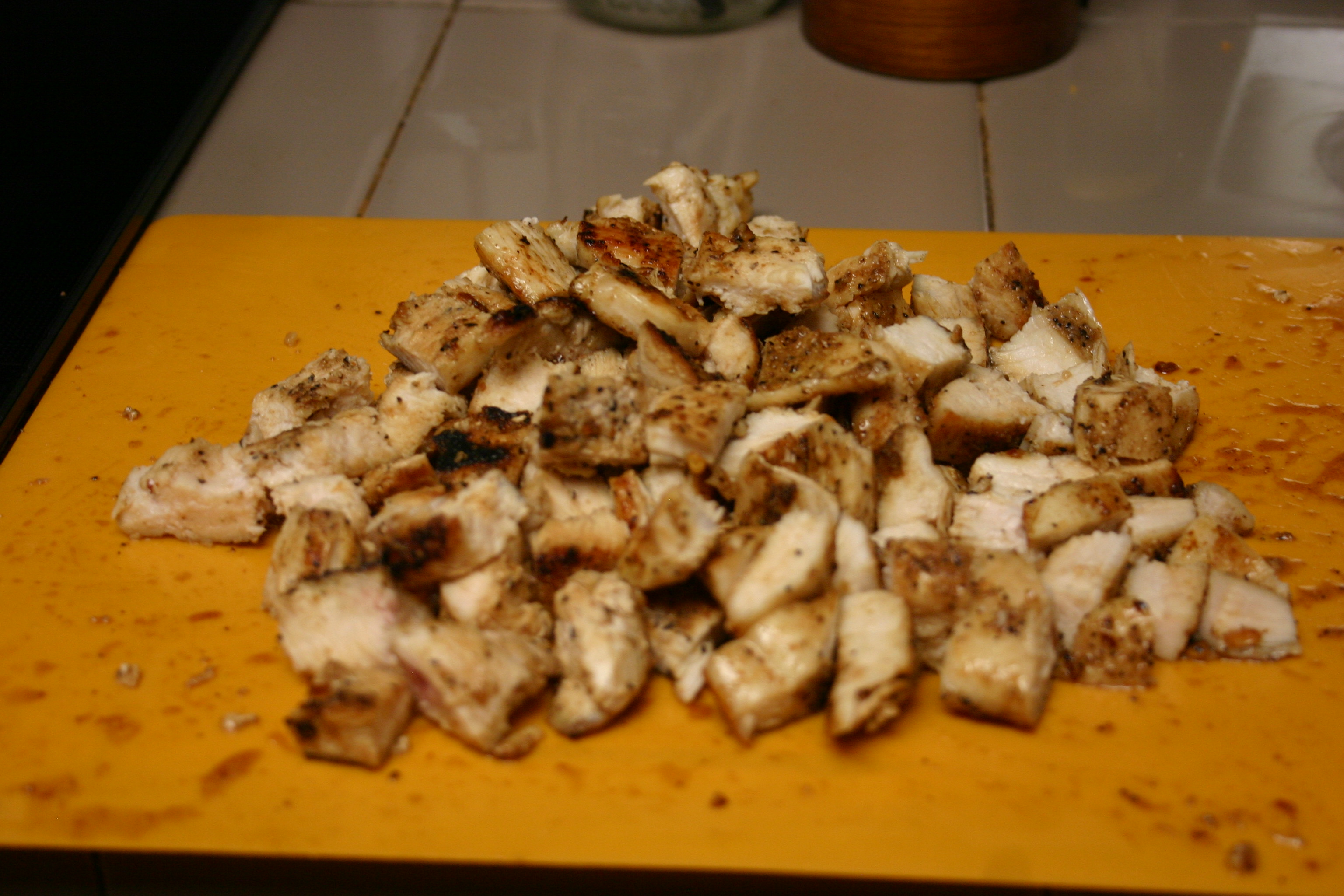 Drizzle a little oil in a large skillet to coat bottom. Heat skillet over medium heat. Cook breasts until just cooked through, about 3 minutes per side. Remove from skillet, let cool to the touch, then dice into bite-size pieces. Set aside.