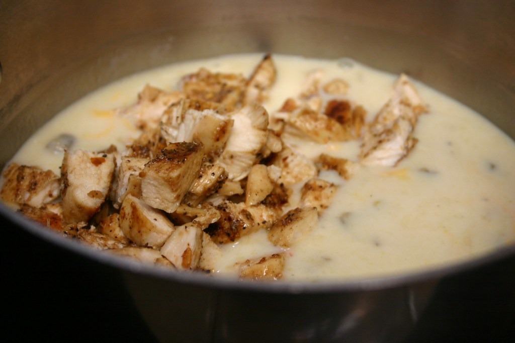 Add chicken, continue to cook until warm and bubbling. If soup is too thick, thin with a little milk.