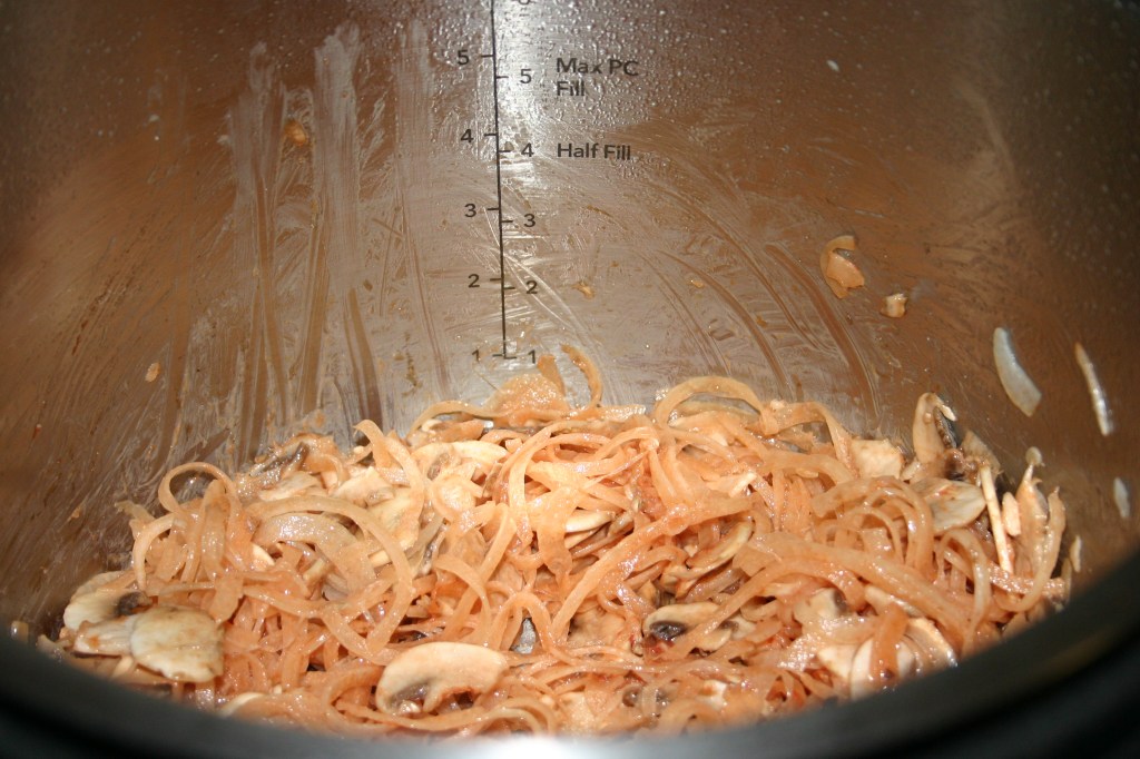 Melt butter. Mix melted butter, tomato paste and salt in slow cooker. Add onions and mushrooms; toss to coat. Stir in beef stock.