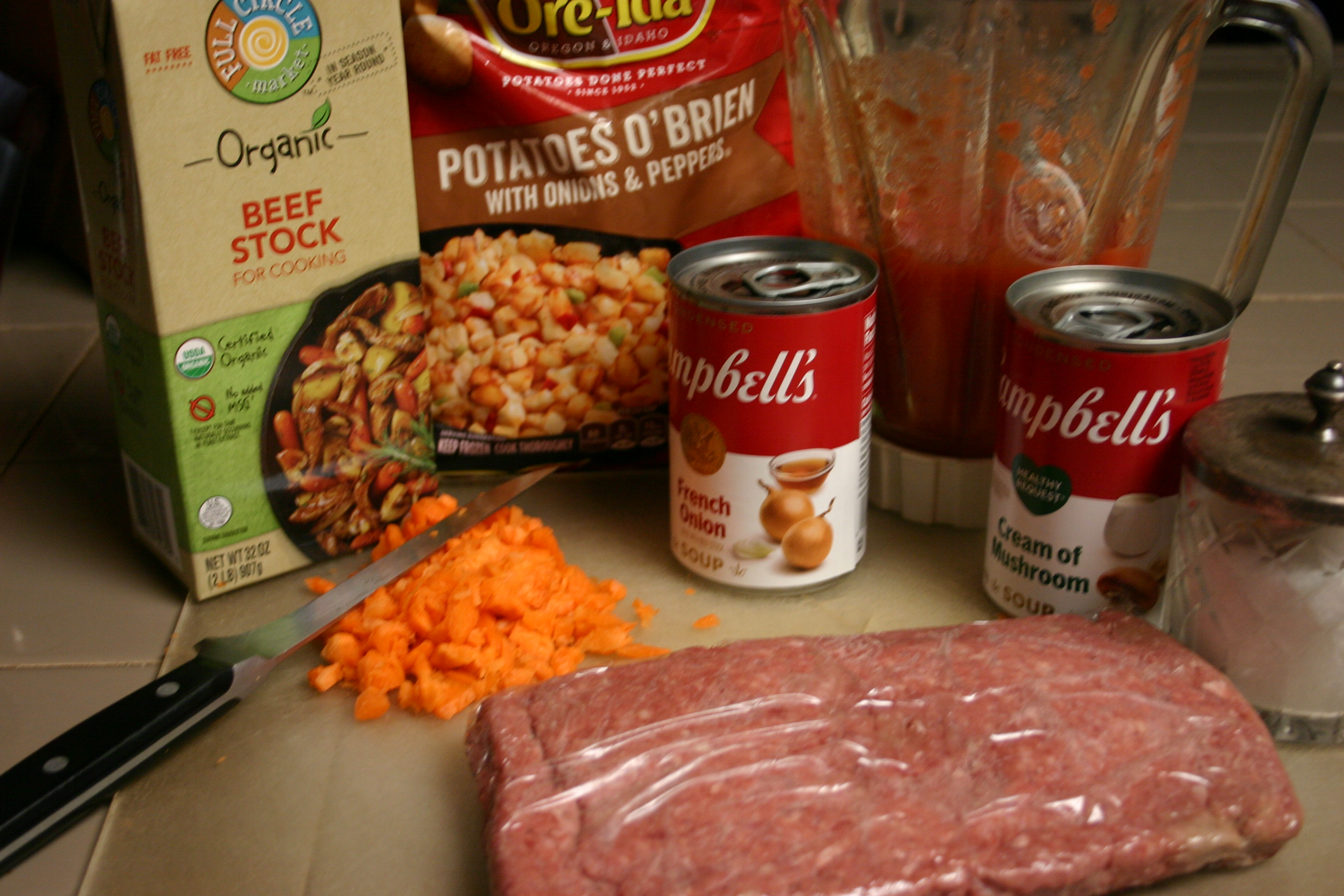 Spray the insert of your slow cooker or Instant Pot with cooking spray. Reserve 1 cup of the potatoes. Gently mix beef, remaining potatoes, carrots, salt and soup mixture in the bowl of your cooker. Sprinkle with reserved 1 cup potatoes.