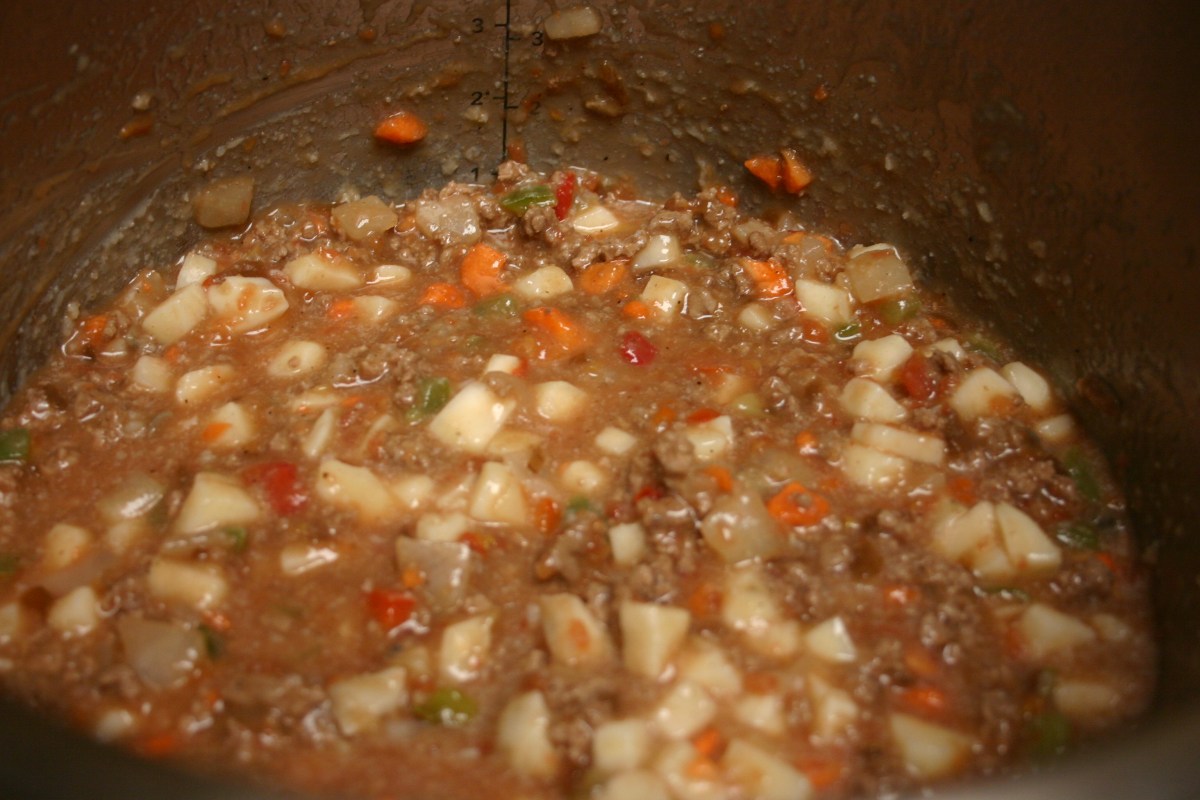 And so was the case for Hamburger Soup O’Brien. It was on the menu, then life happened, so it was pushed ahead for another day. Life had other plans, so it was pushed forward yet again and again. Finally, the day came when nothing stood between me and my meal planner. That is except one little thing – old age. I forgot to thaw anything out. Thank God for the convenience of a microwave. With a little patients and care, anything can be thawed in the microwave. Even bags of frozen potatoes. Go slow, use the defrost timer and keep checking. The goal is to defrost the diced potatoes, not cook them. The same can be said for ground beef. When I do find myself stuck using the microwave to thaw ground beef, I always stop zapping my hamburger meat while the center is still partially frozen. Don’t worry, once crumbled in the skillet, those bits still frozen will thaw beautifully.
