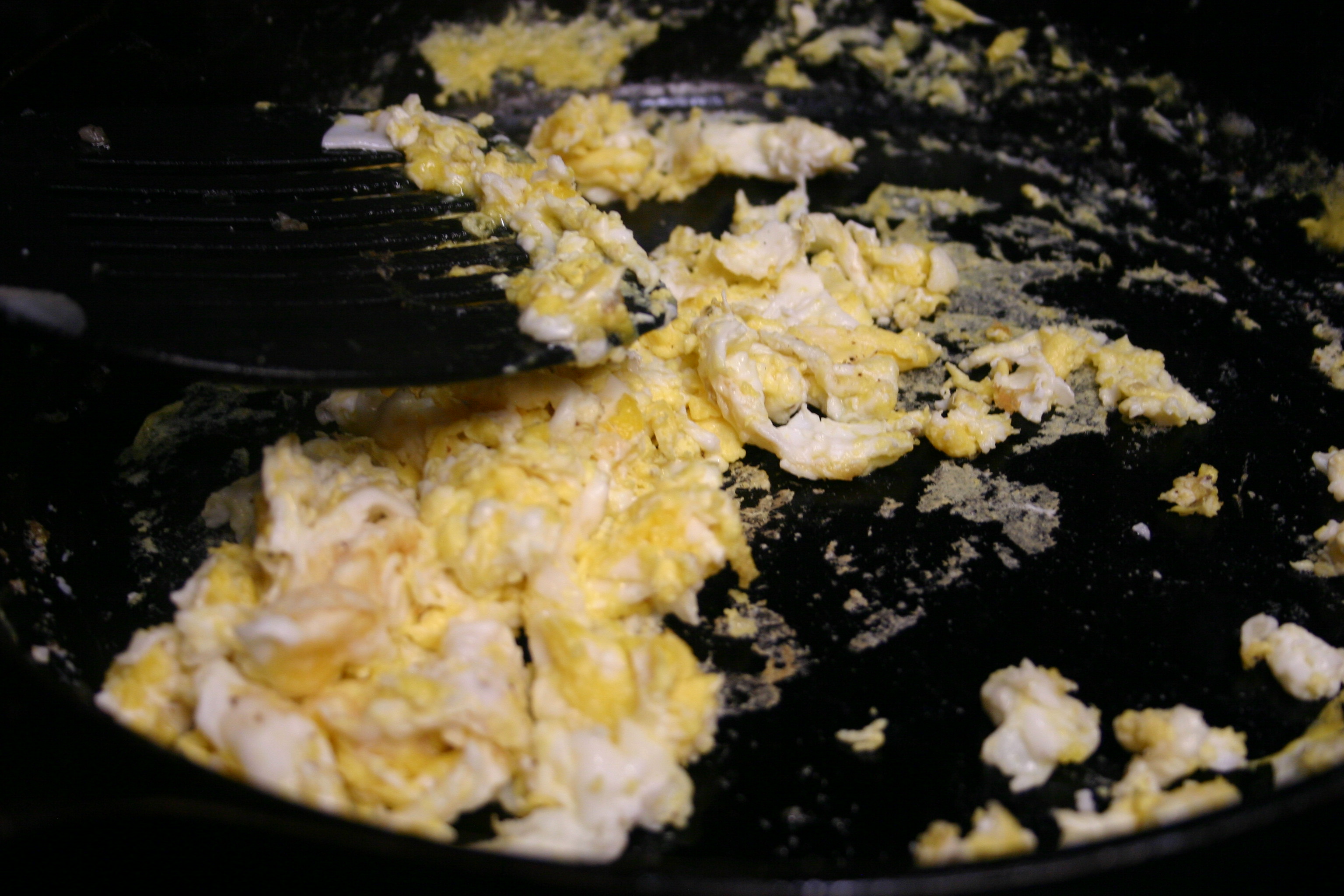 Add a splash more Jalapeno Oil to the now empty skillet. Once the oil is warm, remove skillet from heat. Add eggs, off heat. Season with salt and pepper. Once eggs begin to set, scramble. Return to low heat, continue to cook another few minutes until cooked through. Place scrambled eggs along side the potatoes.