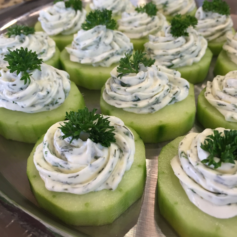 Arrange cucumber slices on a serving platter. Pipe the cream cheese mixture onto each cucumber round. Garnish each bite with a sprig of parsley.