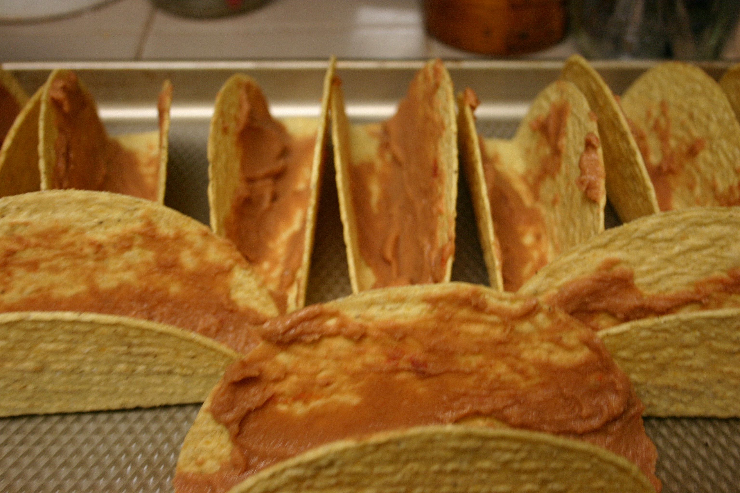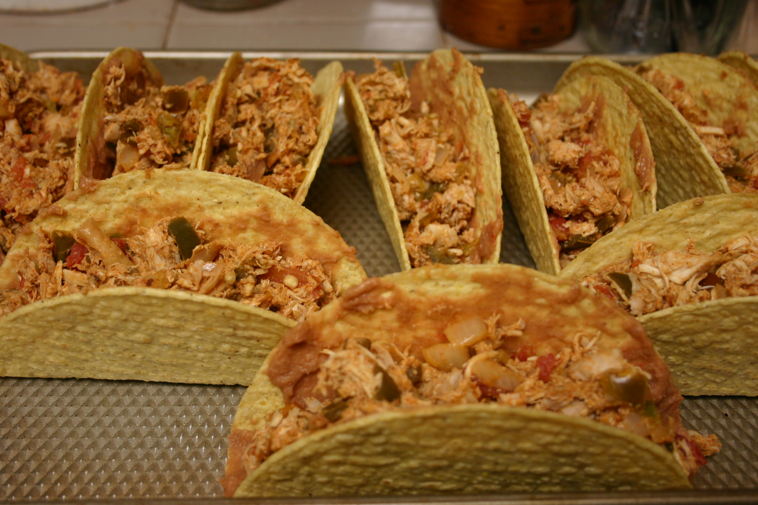 Arrange taco shells on a baking dish. Spoon 1 tablespoon of bean dip into the bottom of each taco shell. Top with the chicken mixture, almost to the top of each shell.