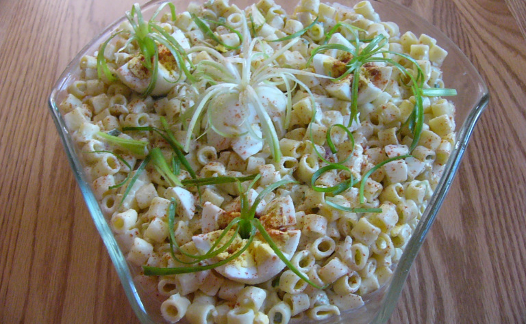 Place macaroni in a large mixing bowl. Pour egg dressing over macaroni. Stir to blend and coat everything together. Transfer salad to a large serving bowl. Smooth top.