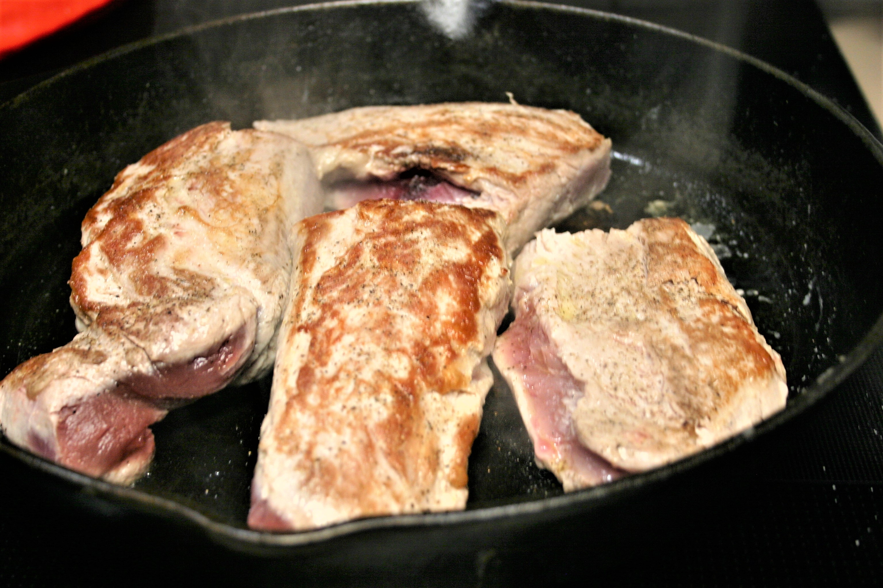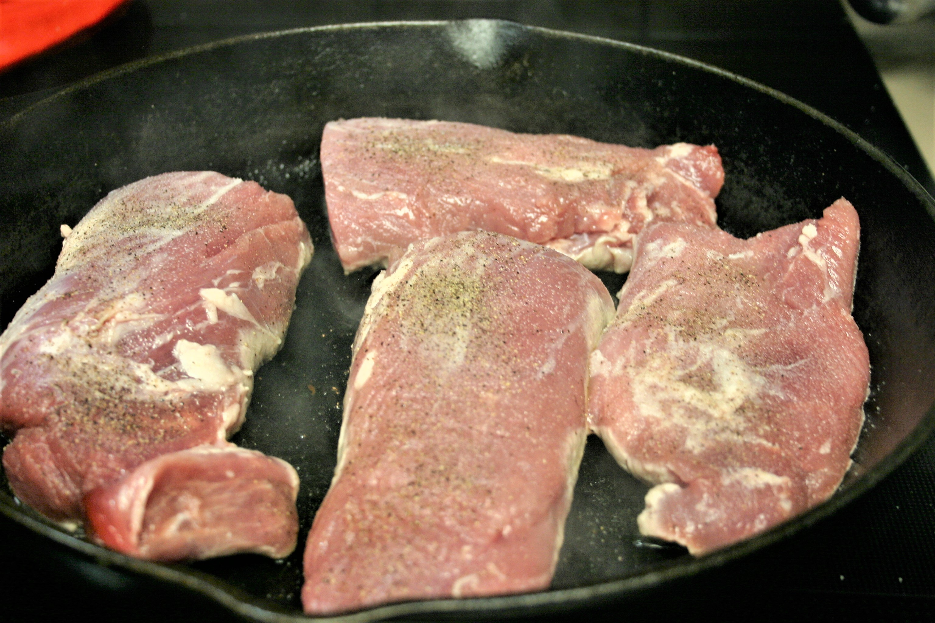 Cut each tenderloin in half to fit easily into the skillet. Season pork to taste with salt and pepper, set aside.