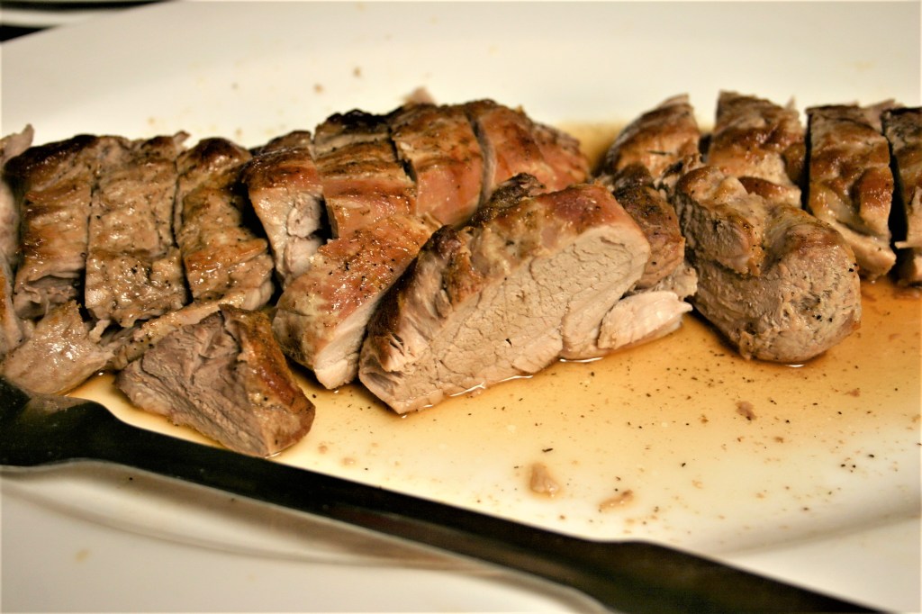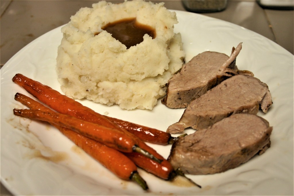 Remove pork from oven, transfer to a serving platter. Tent and let rest 5 minutes. Slice tenderloin, pour pan drippings over the pork and serve.