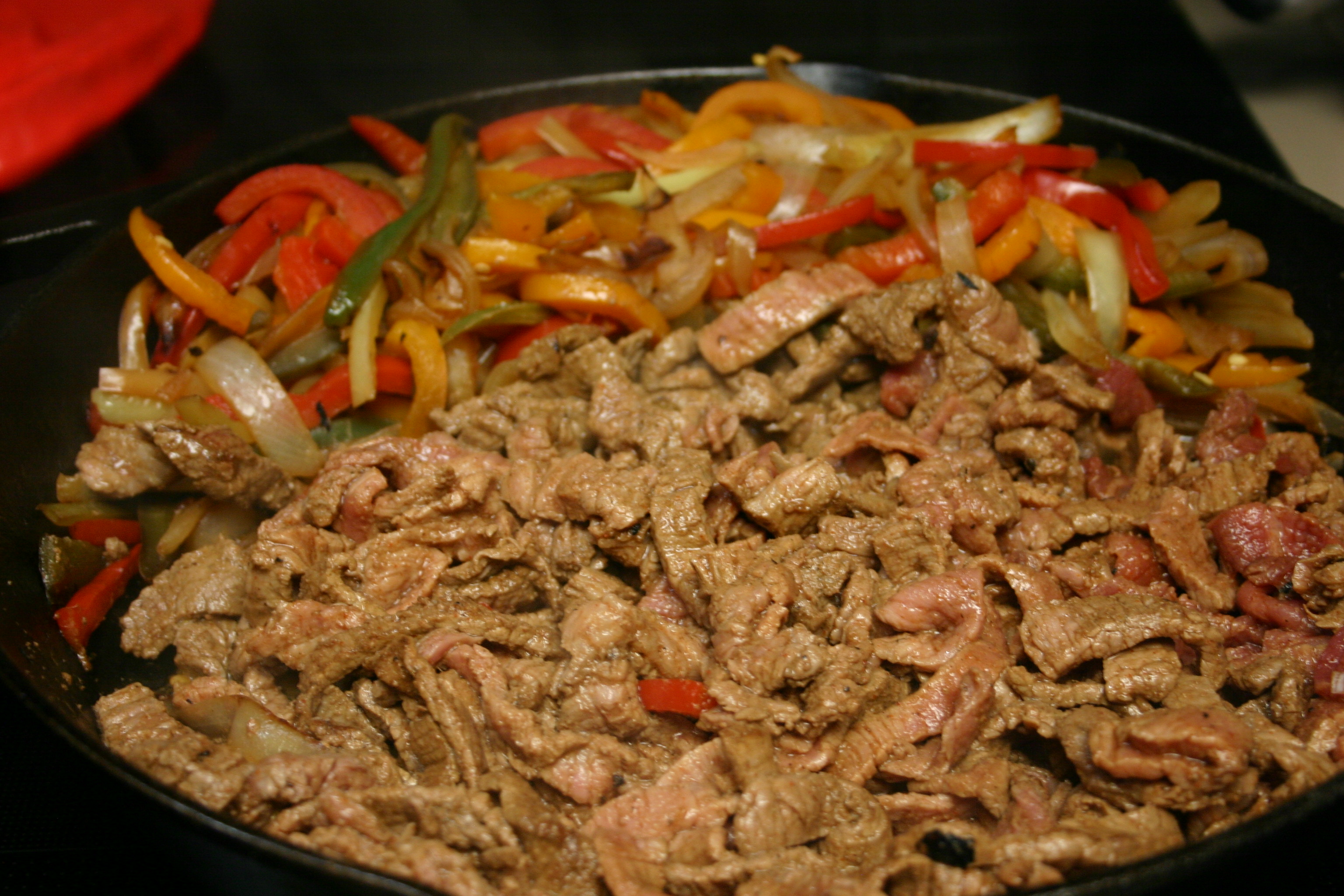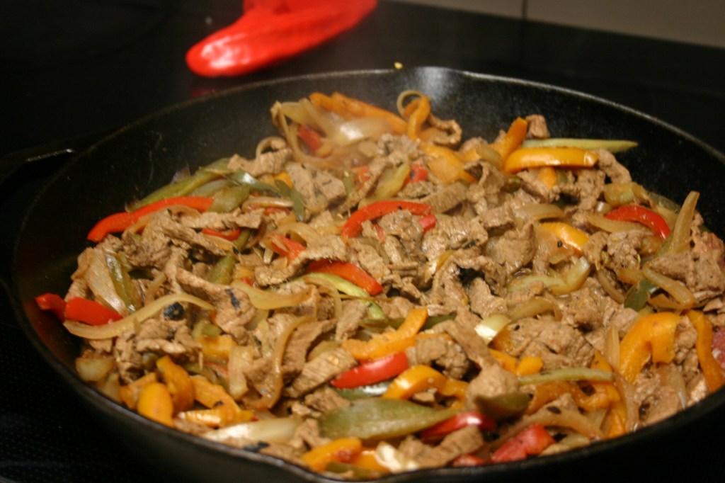 When the vegetables are tender, press them against one side of the skillet, creating a large opening for the meat. Add just a hint of olive oil into the empty side of the skillet. Fill with steak. Let sizzle a few minutes, stir-fry the meat until just cooked through, about 5 minutes.