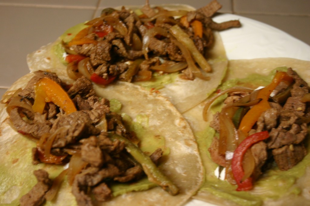 Spread sour cream and Guacamole over tortillas. Fill center with meat-vegetable mixture. Wrap tortilla around filling, and enjoy!