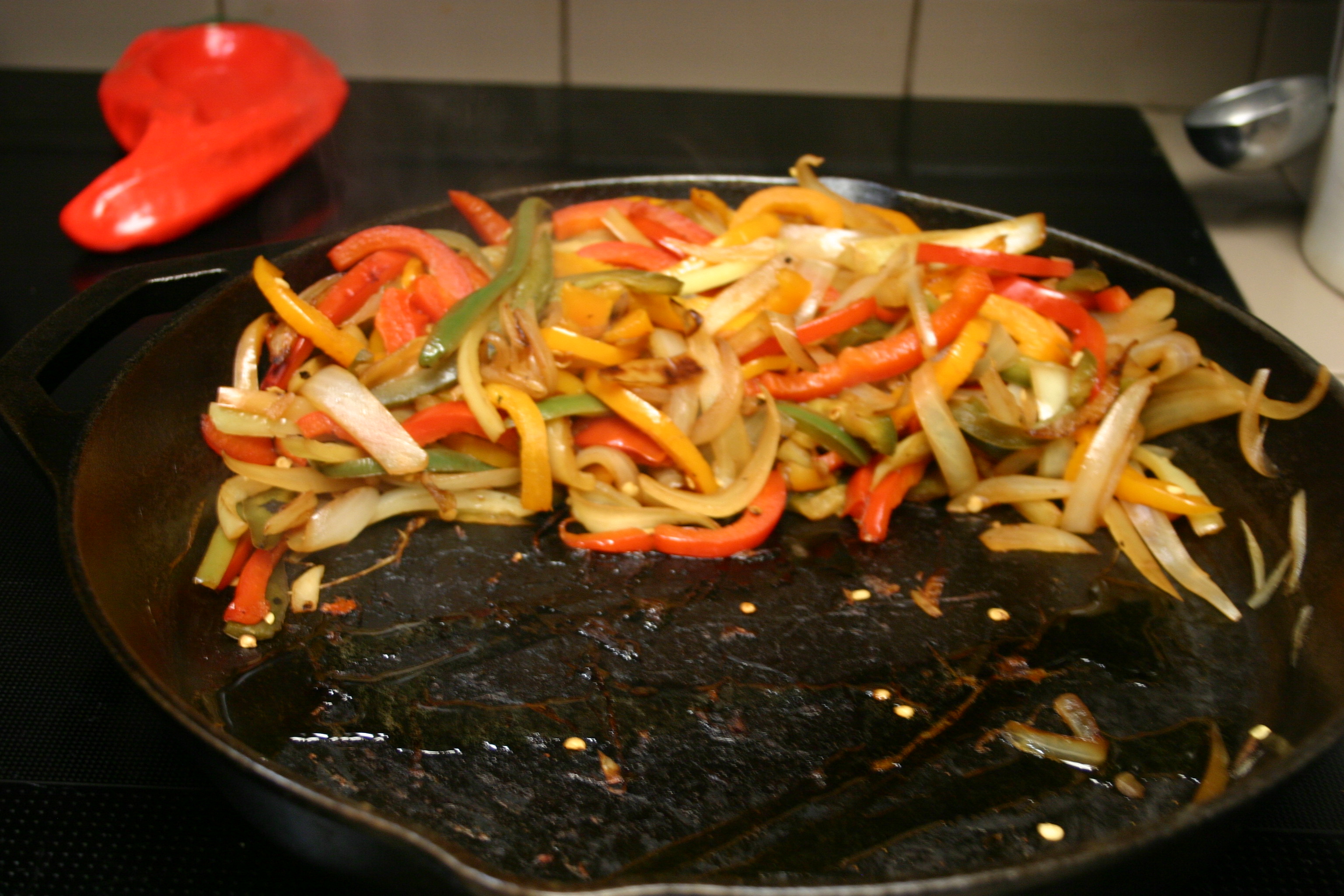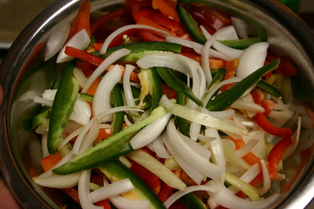 Stem, core and slice all the peppers into thin strips, set aside in a large mixing bow.. Peel onion, cut into thin slivers, toss into the bowl with the peppers.