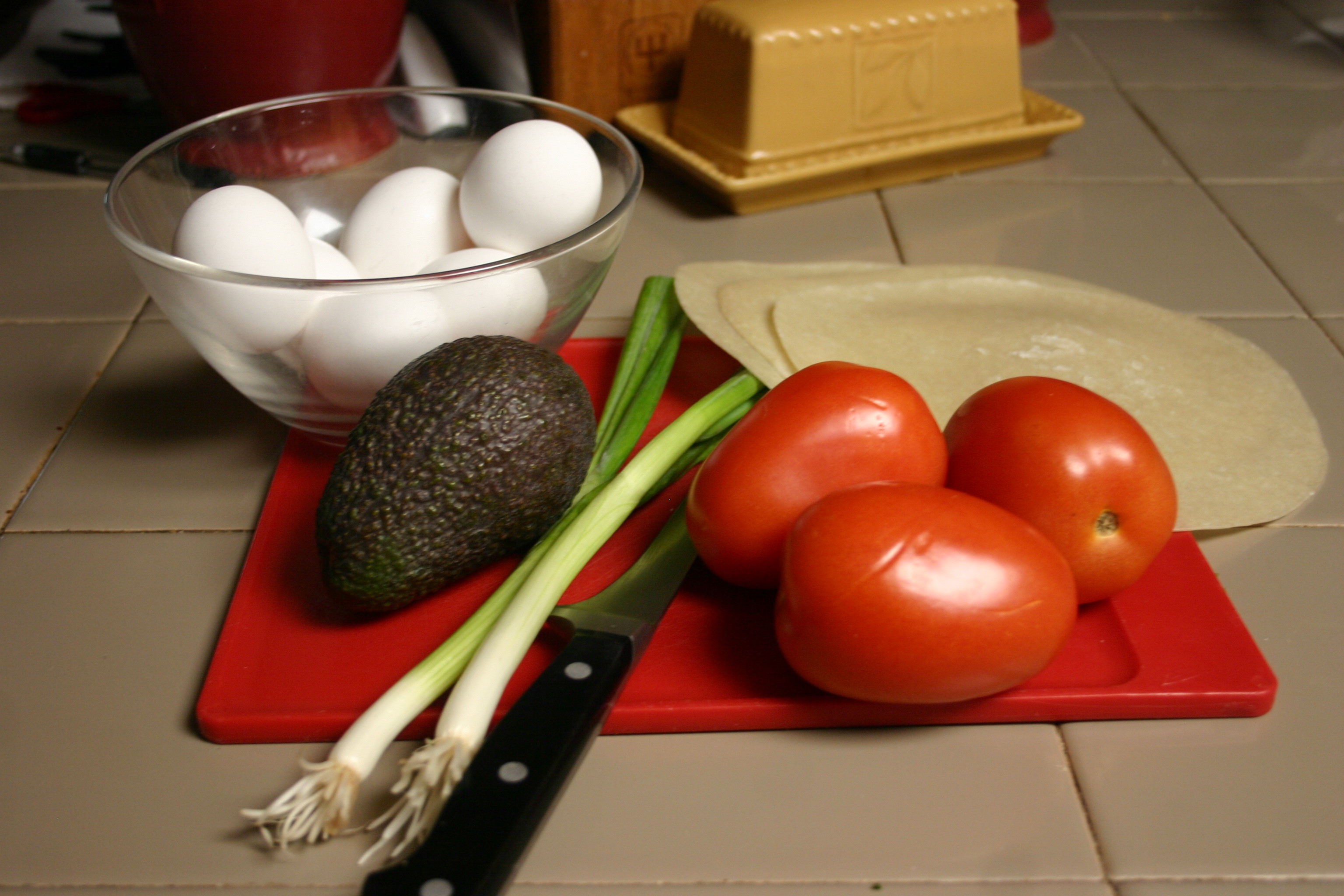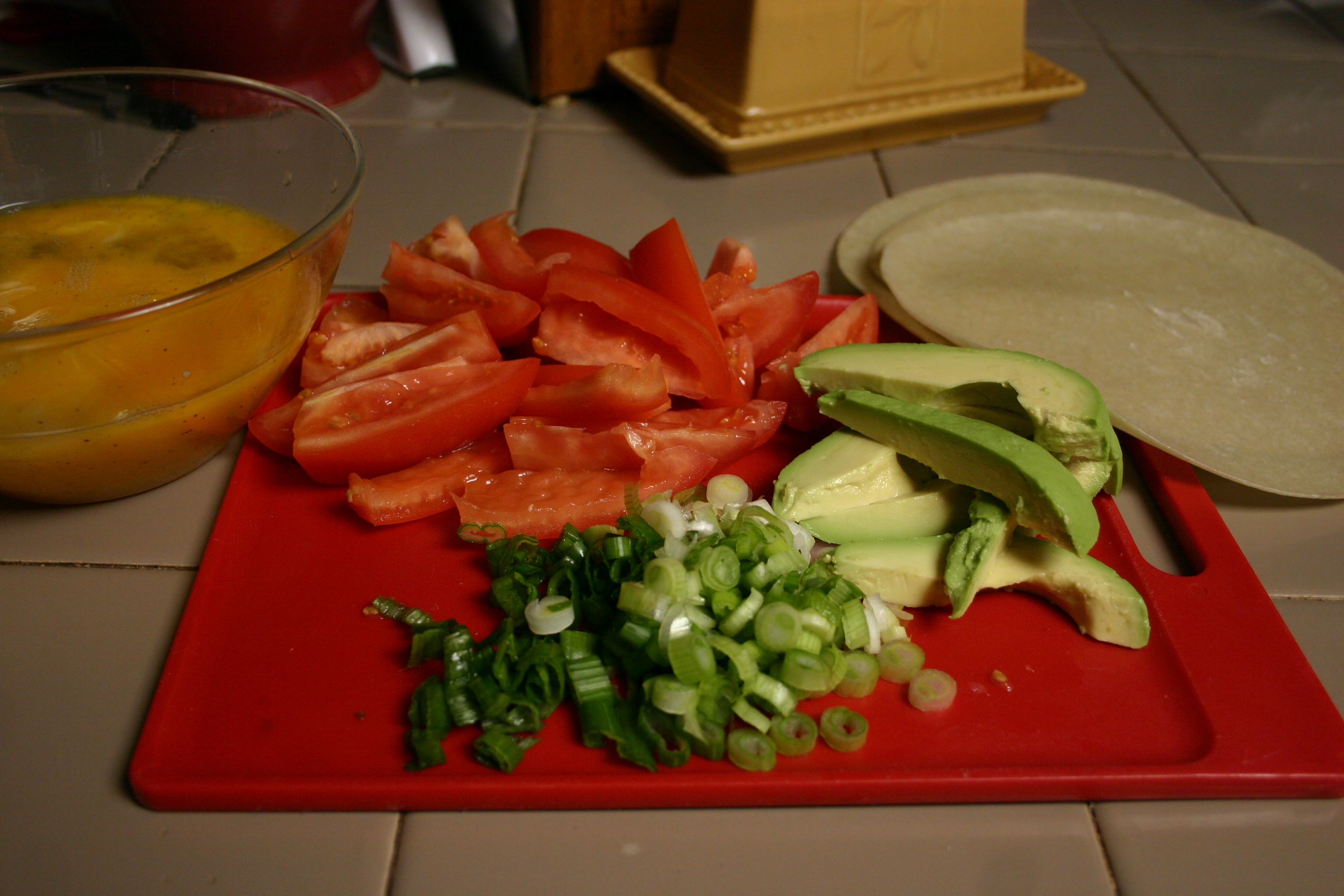 Slice tomatoes into 8 wedges each, remove seeds and set tomato wedges aside. Trim roots from green onions. Thinly slice onions, set aside. Cut avocado in half, remove stone. Slice avocado into wedges, remove skin. Wrap tightly and set aside. Lightly beat eggs in a bowl, season with salt and pepper, set aside.