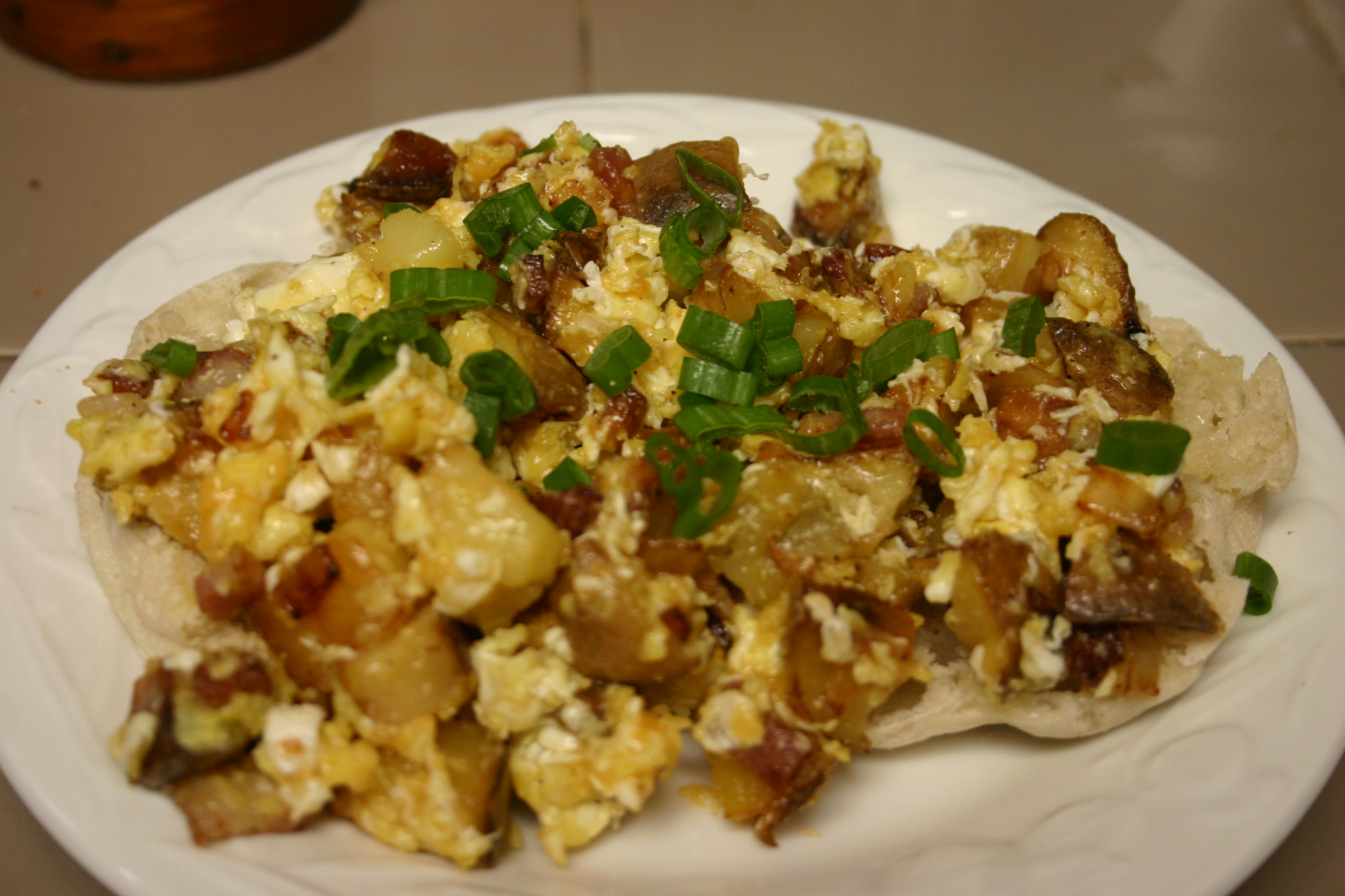 Cut potatoes into small cubes, set aside. Peel and mince onion, set aside. Chop bacon, set aside. Split English Muffin, toast and brush with butter. Keep warm until ready to use.
