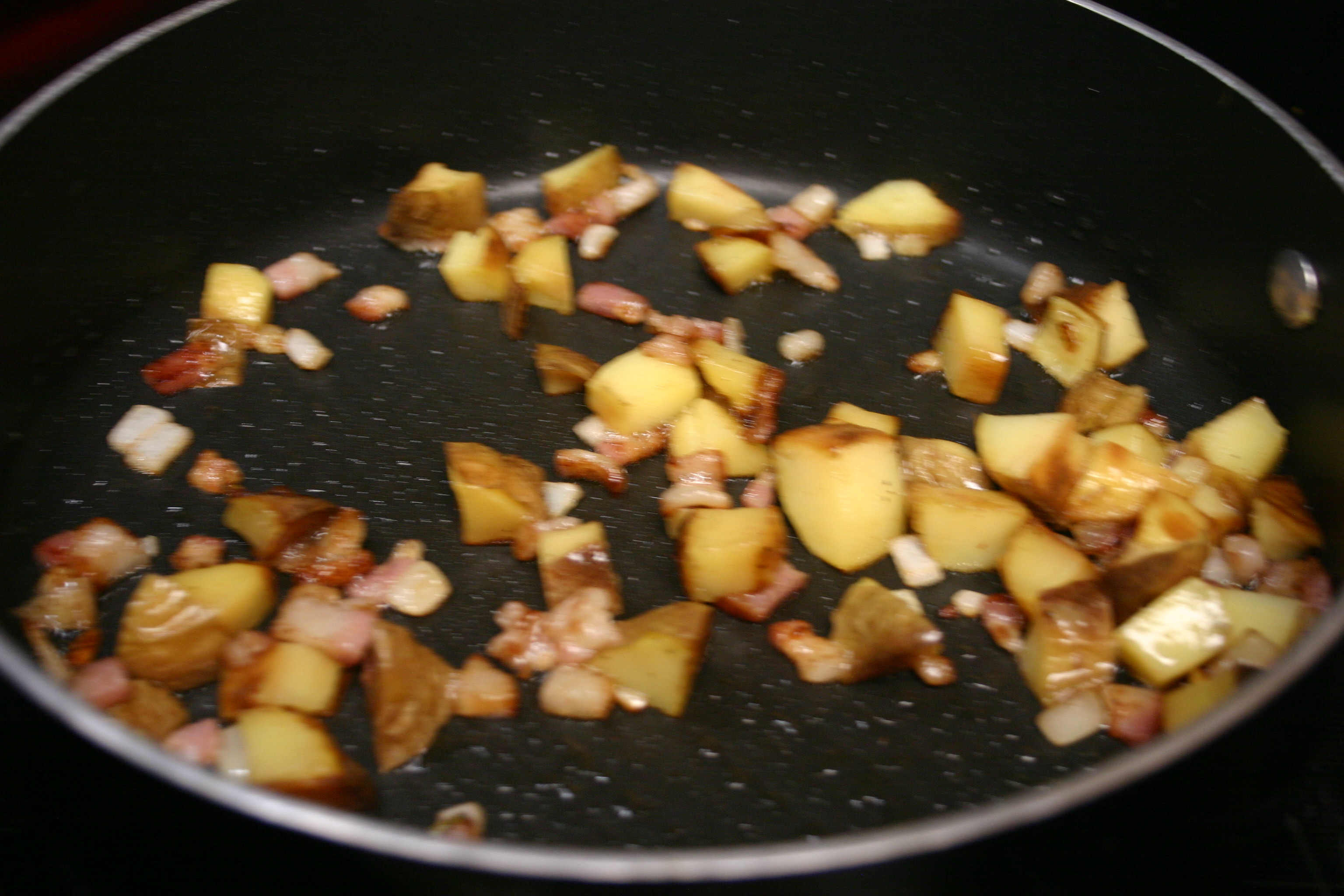 In a small skillet over medium heat, fry diced bacon with onions until bacon is just beginning to crisp. Add diced potatoes, continue to fry until potatoes are warmed through and an thin brown crust has begun to form on the potatoes. Add egg. Season with salt and pepper.