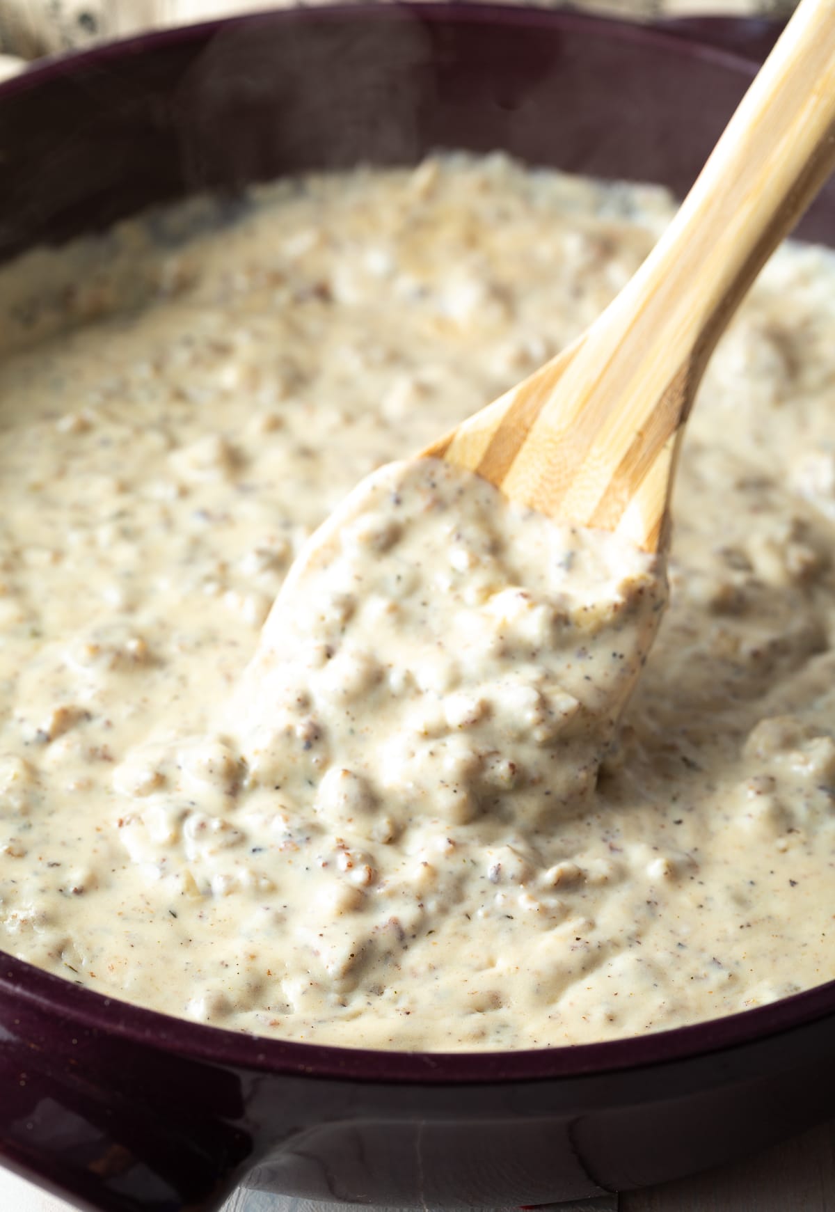 Gradually add milk, stirring well after each addition. Reduce heat to simmer and allow gravy to thicken. After adding 2 cups of milk, remove from heat. If thinner gravy is desired, add remaining 1/4 cup of milk. If not, simply season with salt and pepper.