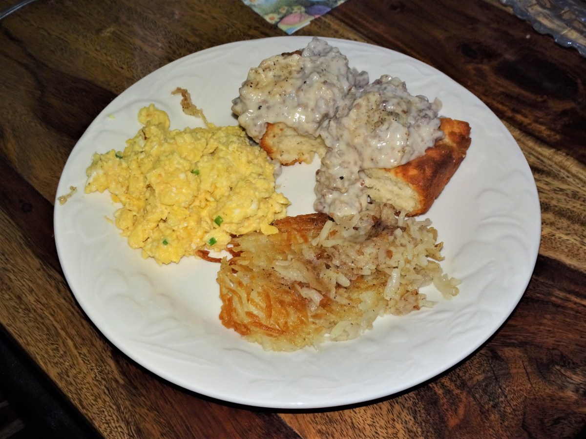 What goes better with warm, fluffy biscuits in the morning than sausage gravy, hash brown potatoes and scrambled eggs?