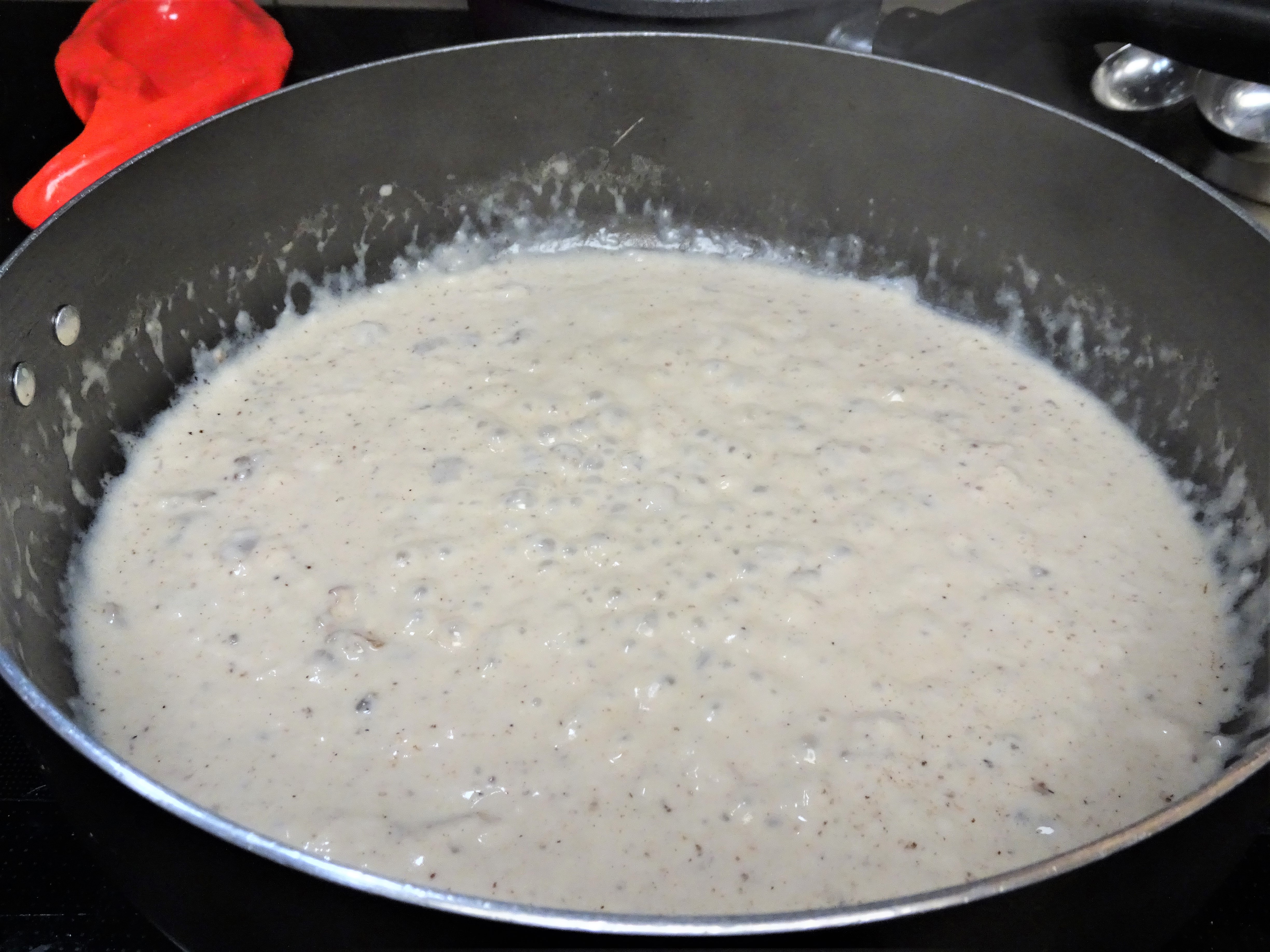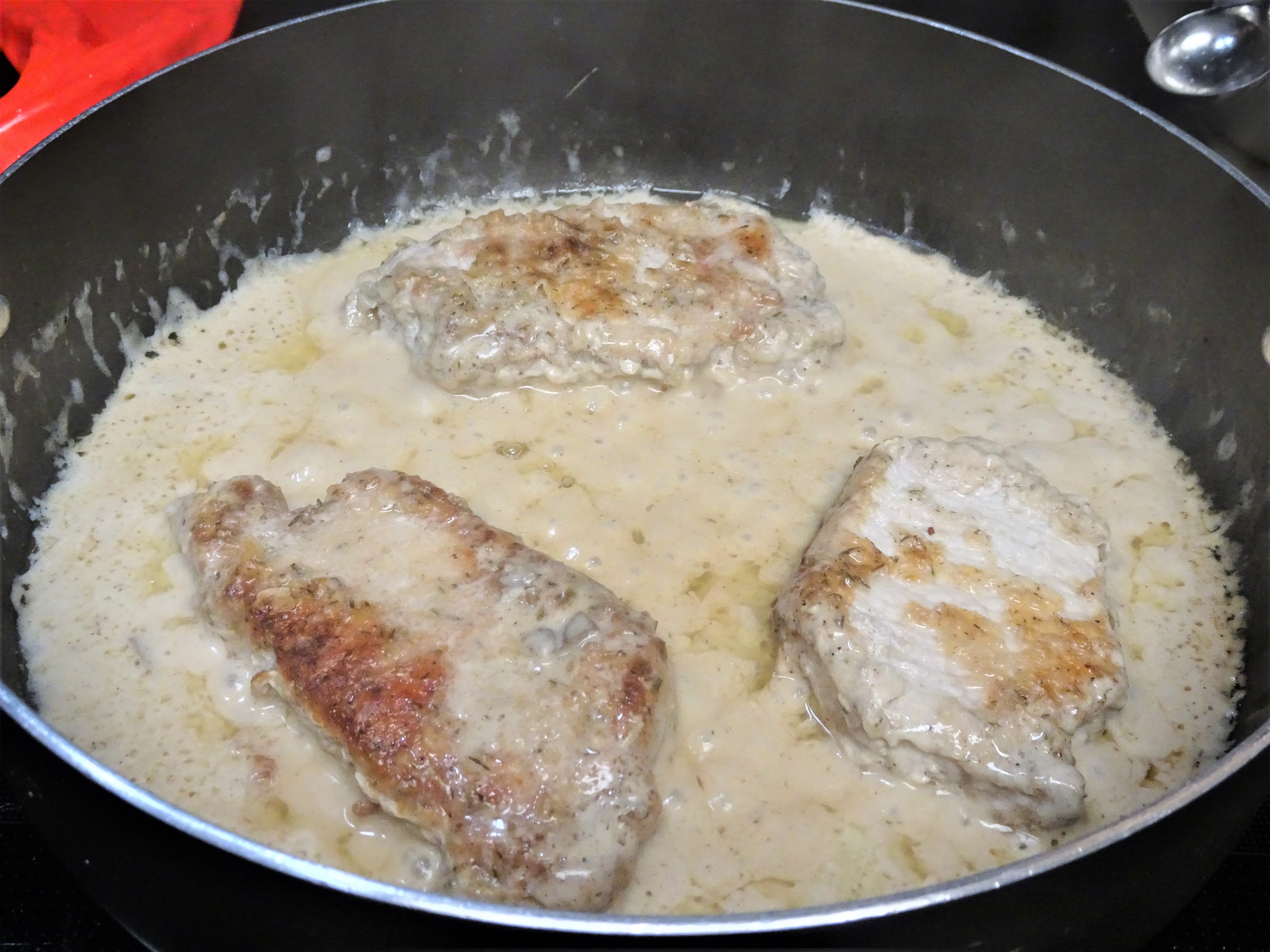 To the now empty skillet, combine soup with milk. Bring to a boil. Return pork chops to the skillet along with any drippings that may have accumulated on the plate.