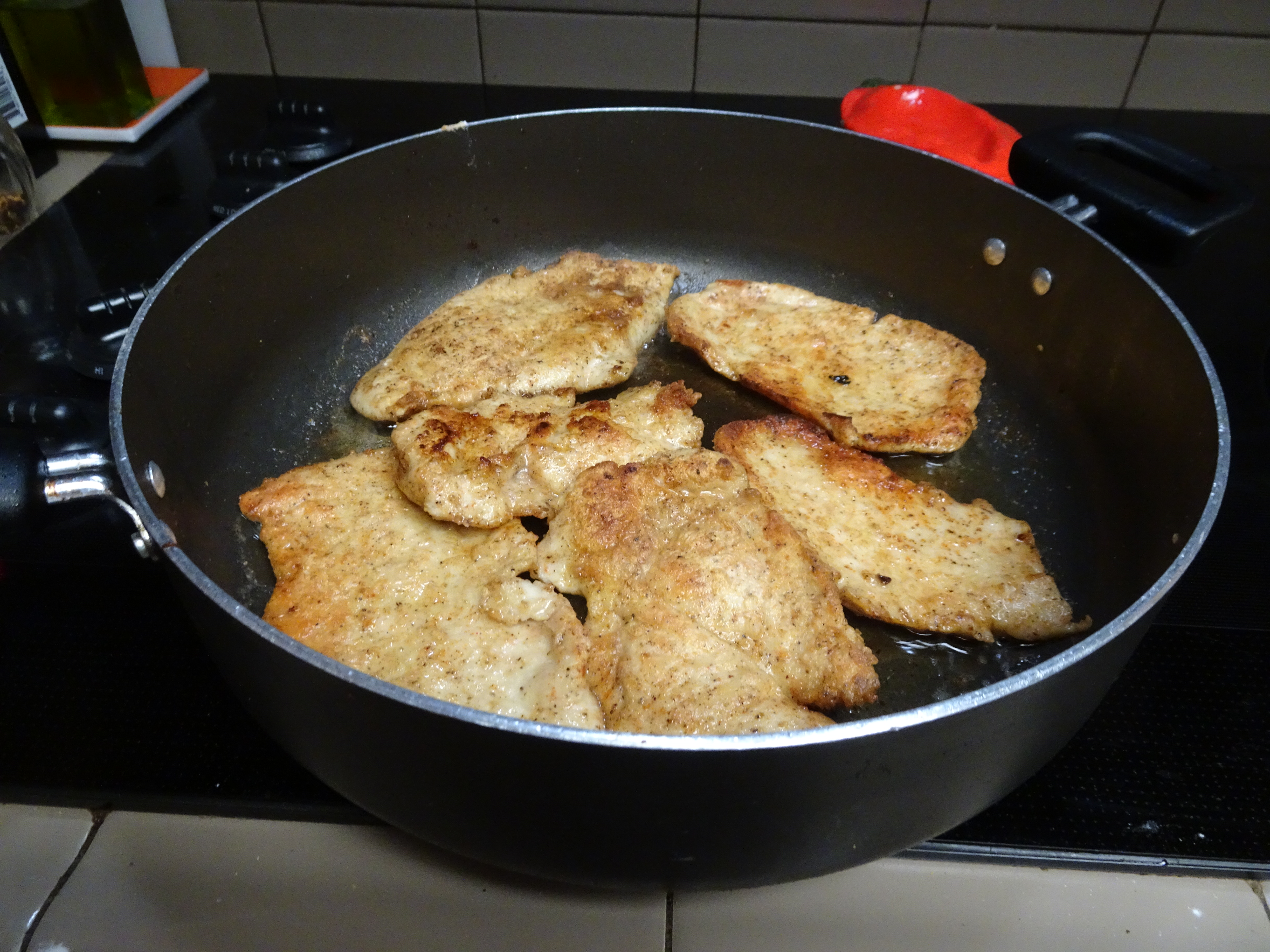 Note: A 1-pound package of thin-sliced chicken breasts will provide about 6 or 7 thin breasts. Either cook just what is needed or cook all the chicken. These breasts make for great cold sandwiches later in the week if desired.