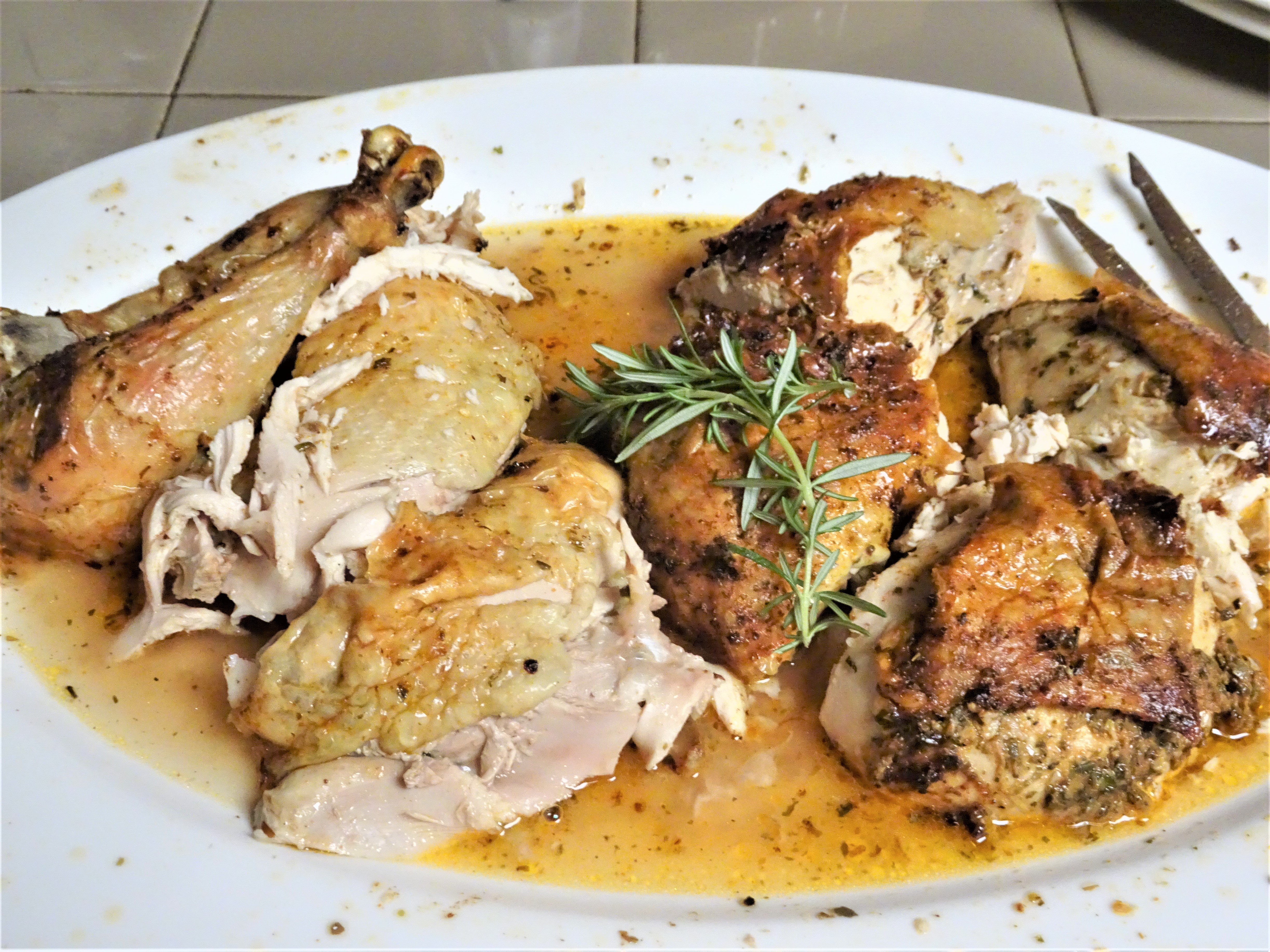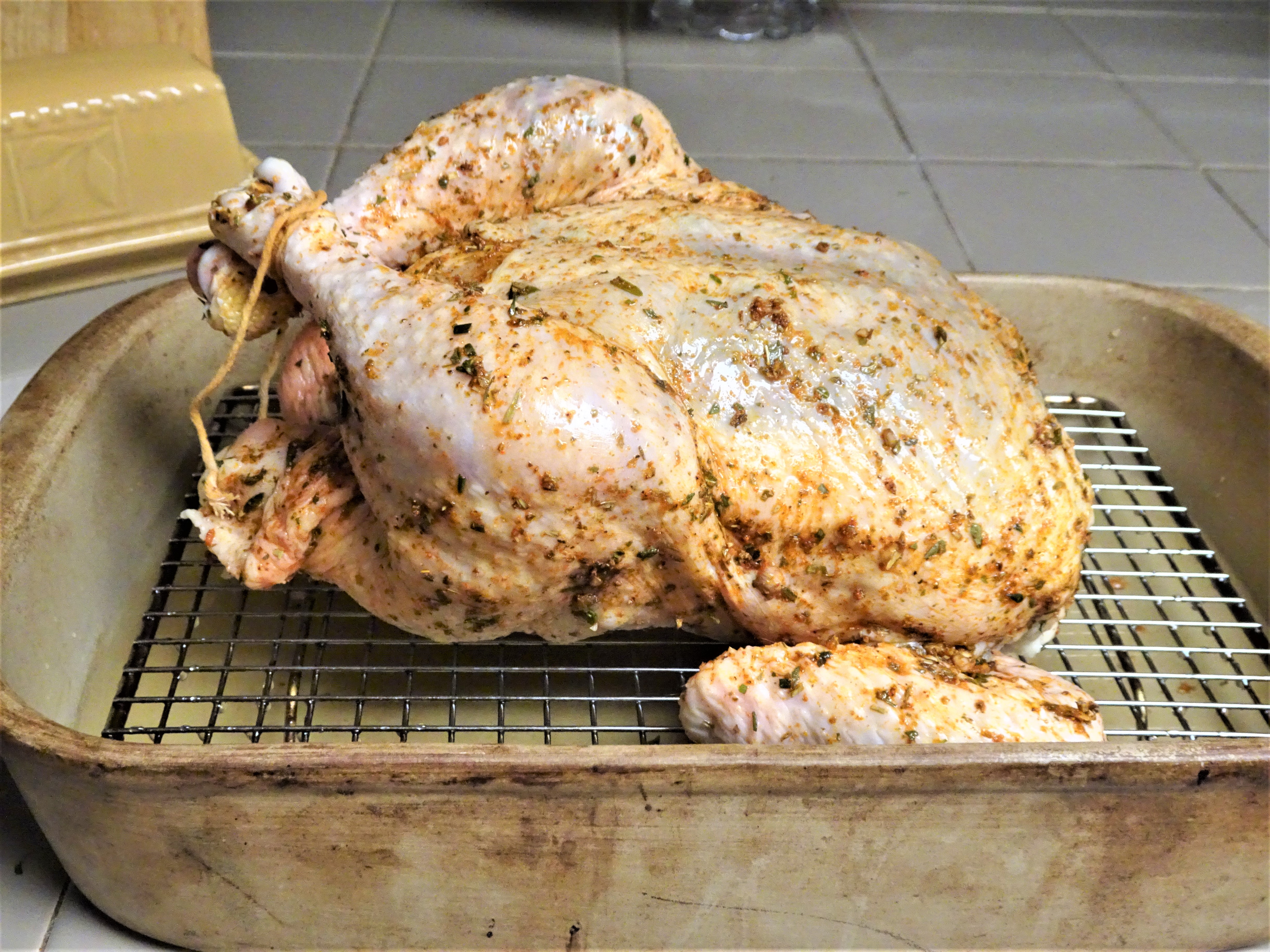 Beginning at the neck, using finger tips, gently loosen skin from the breast, legs and thighs. Gently pat the skin in place, then rub the skin of the entire bird with the herb seasoned oil.