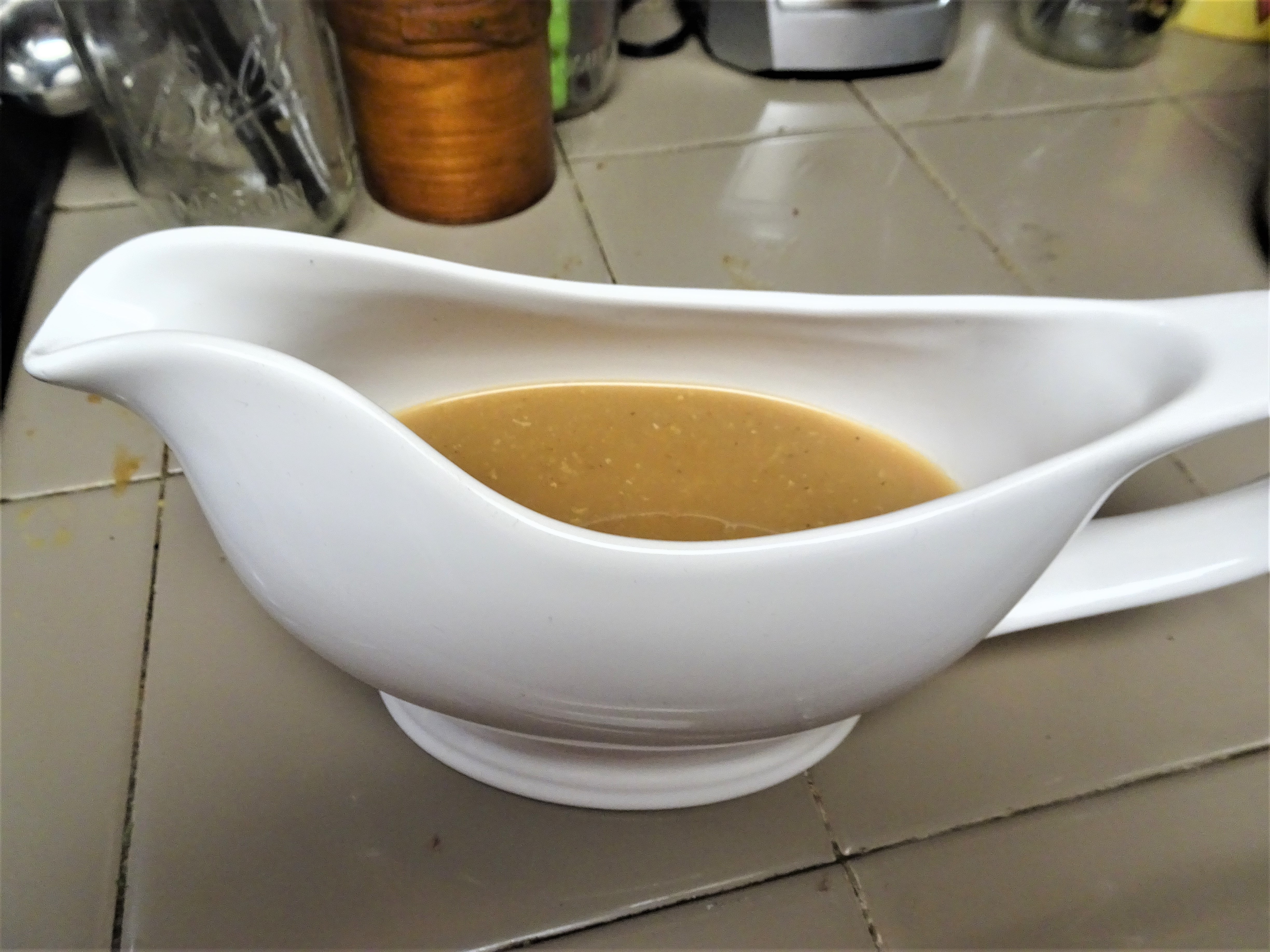 To serve, carve chicken. Pass the gravy at the table. Serve with your favorite sides and enjoy.