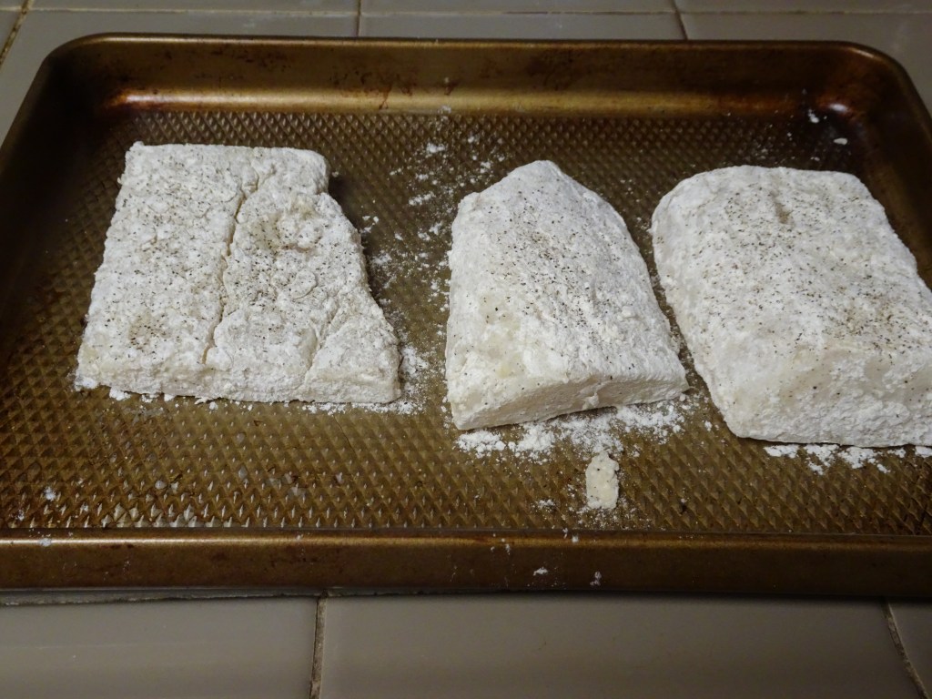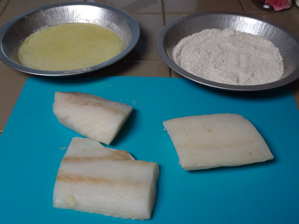 Dip fish into butter-lemon mix, coating well on all sides. Dip buttered cod into the flour mix, coating well on all sides. Shake excess flour off of the piece of fish.