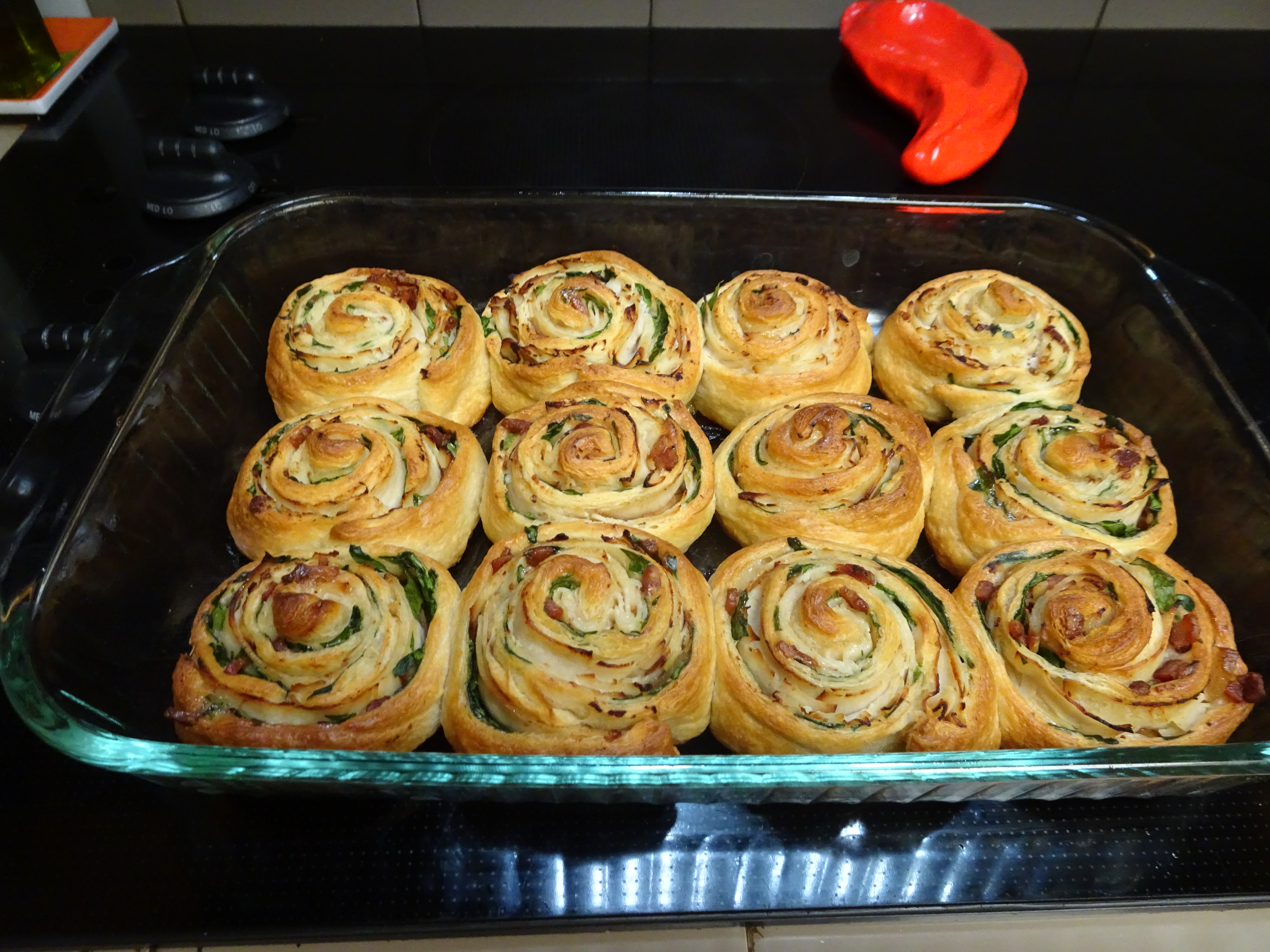 Layer 1/2 cup of the spinach leaves, half of the bacon and half of the turkey over the dough. Starting on the short, topped edge of rectangle, roll up tightly, and pinch seam together. Repeat with remaining dough sheet, mayonnaise, spinach leaves, bacon and turkey.