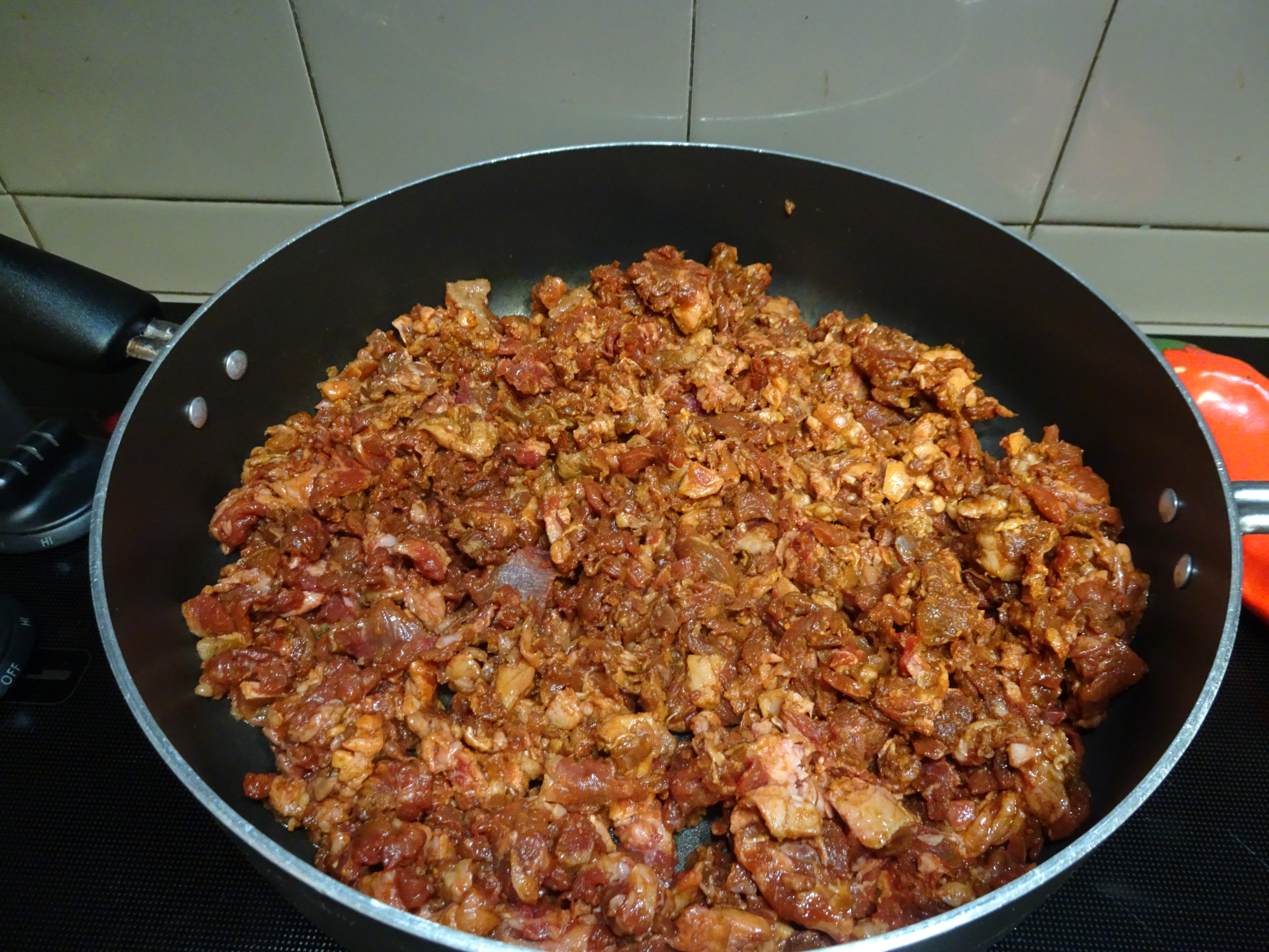 Stack skirt steak, chop into small pieces. Place in a bowl. Add chipotle pepper paste. Work into the meat. Cover and refrigerate for several hours.