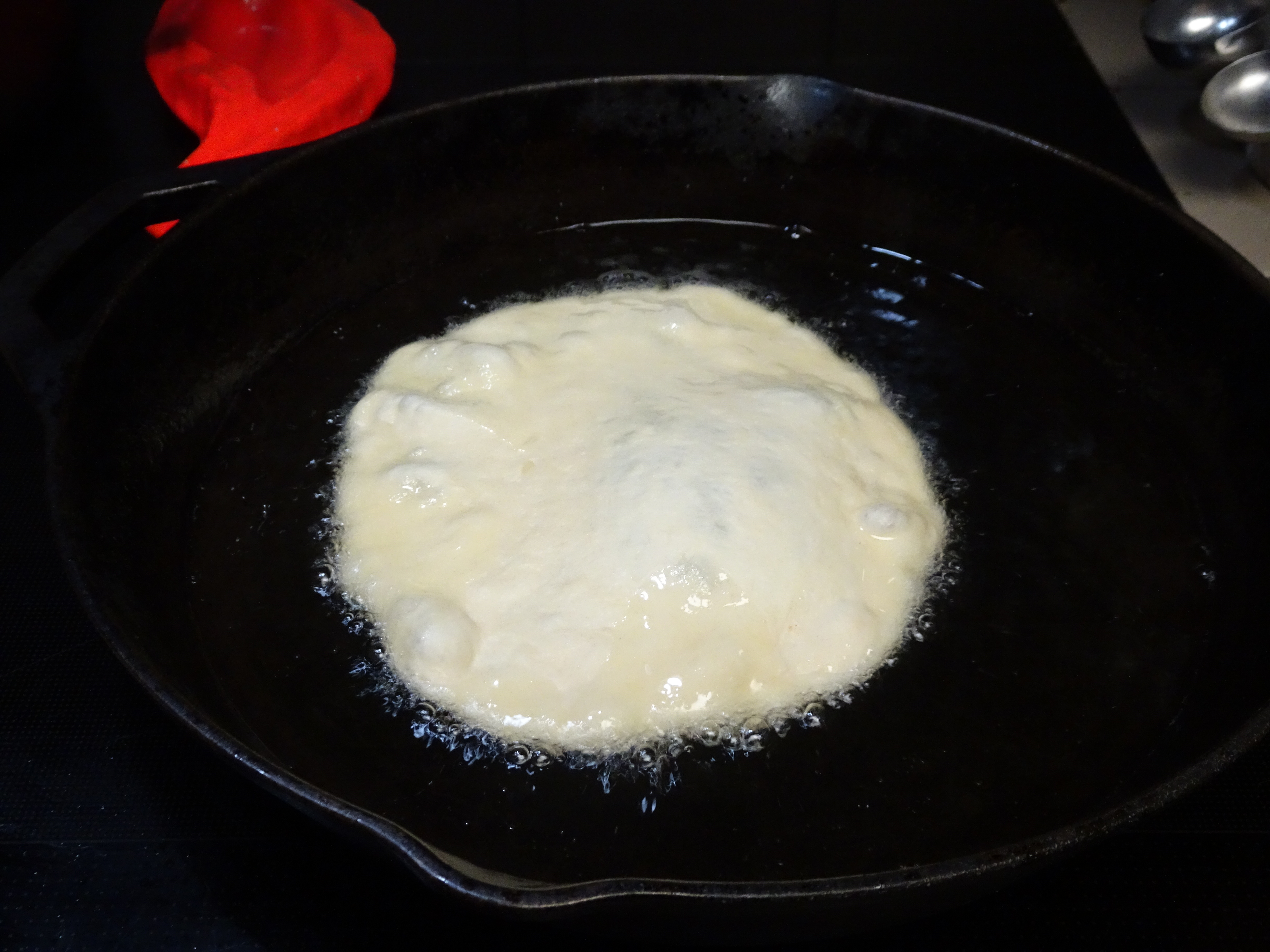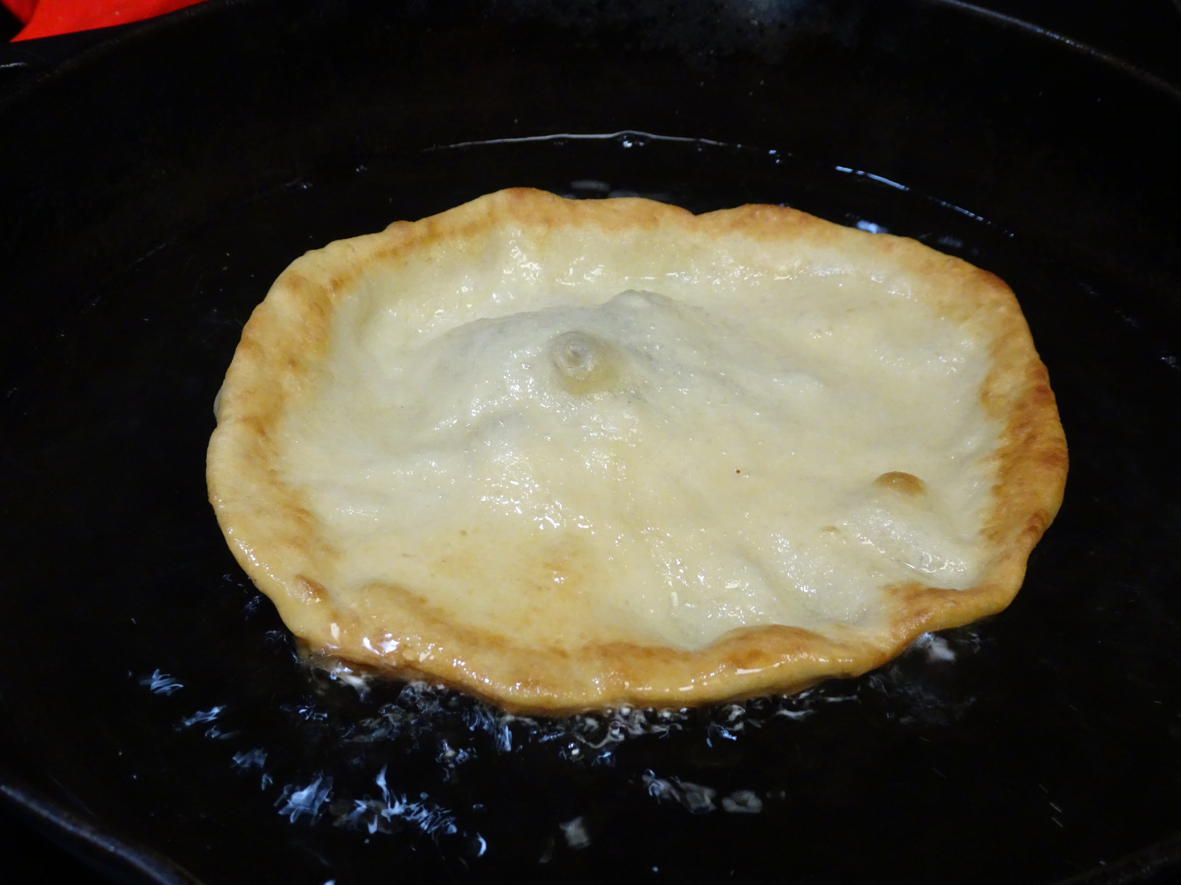 Heat about an inch of oil in a large cast iron skillet. Fry bread in hot oil until golden brown, swirling as it cooks to prevent burning. Use the end of a wooden spoon to swirl bread as it cooks, flip and continue to brown until done. Place on a paper towel, blot off excess grease and set aside in a warm oven. Repeat until all the bread has been fried.
