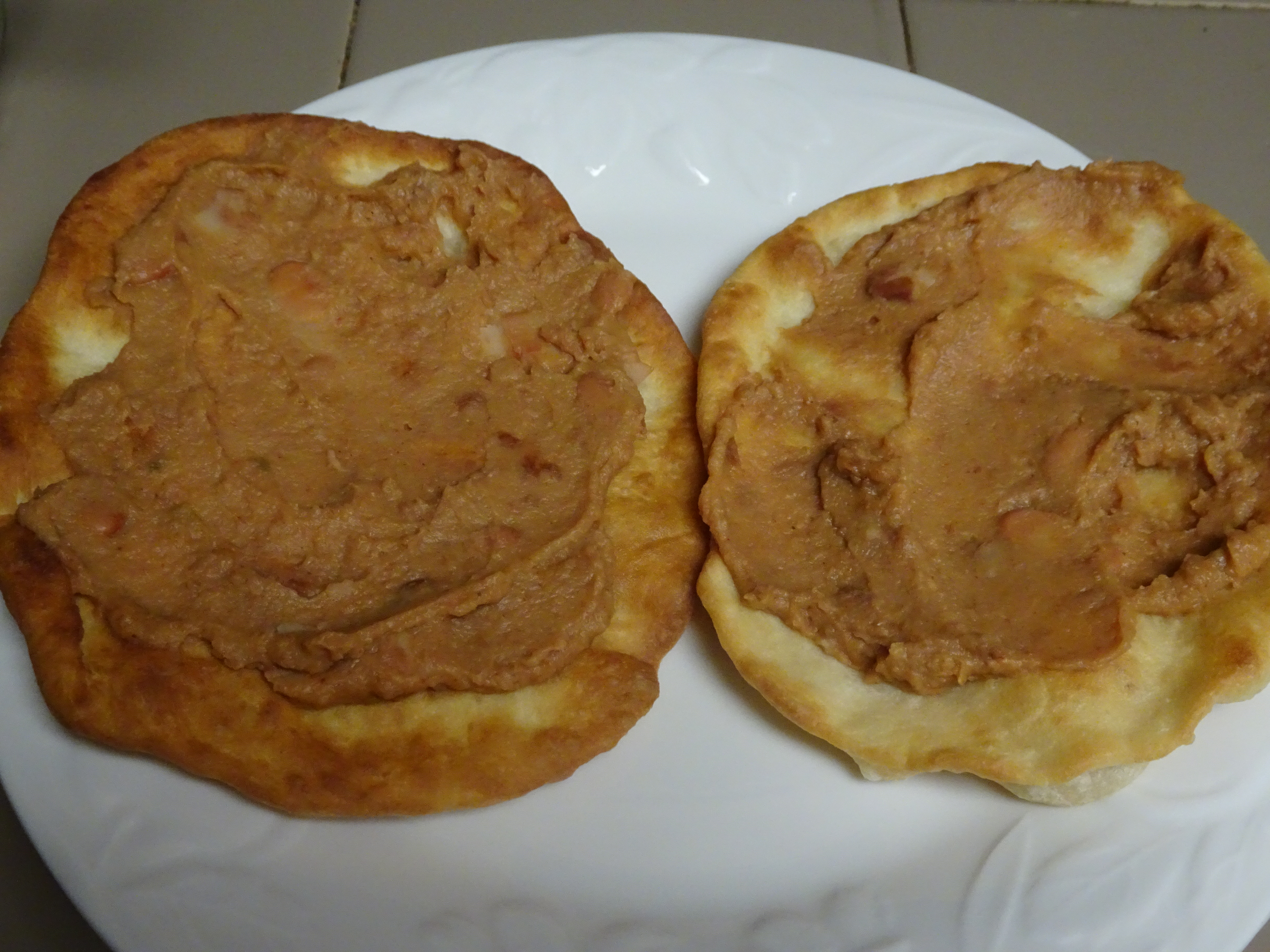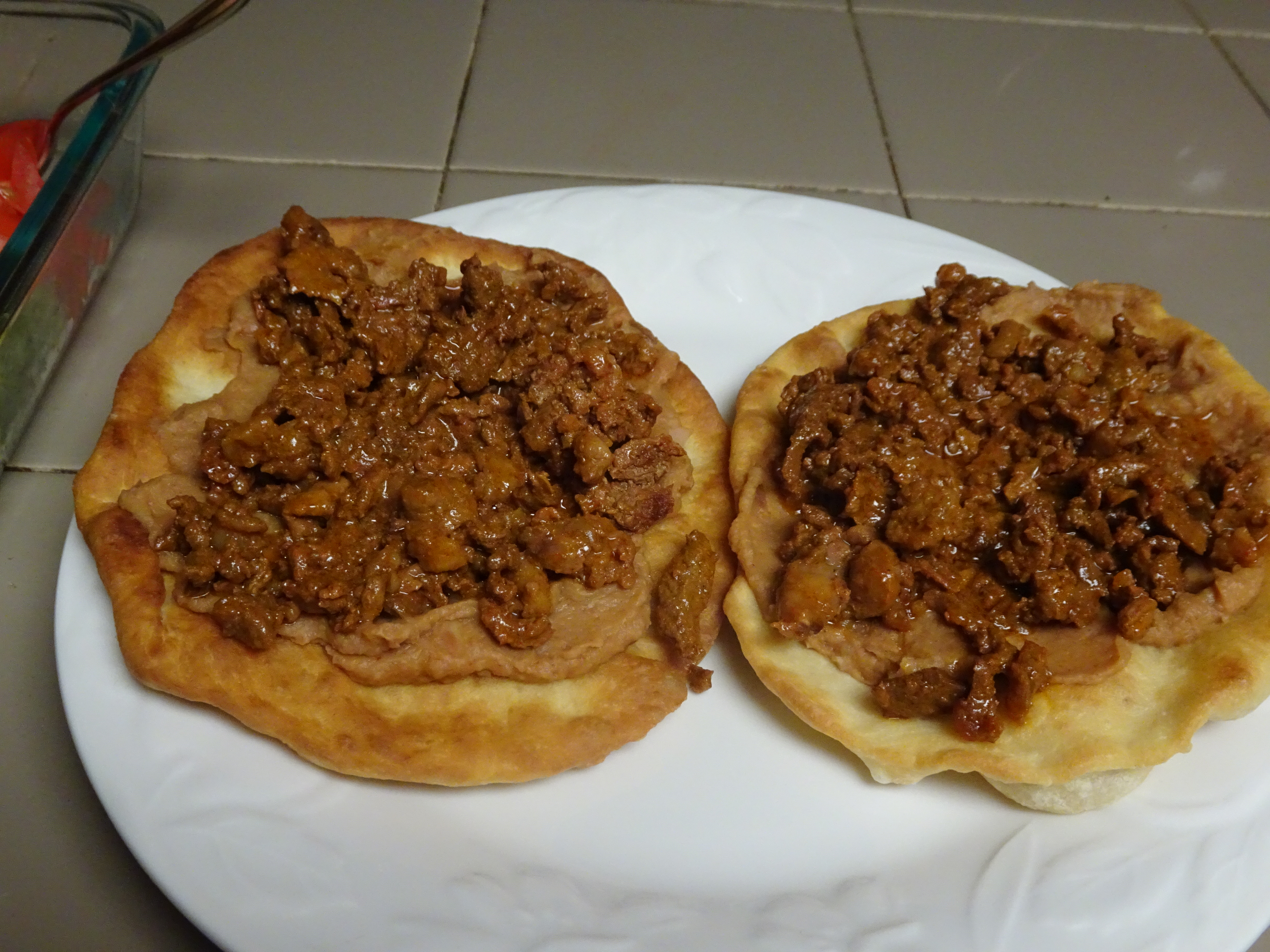 Spread warm beans on fry bread. Top with meat, garnish as desired and enjoy.