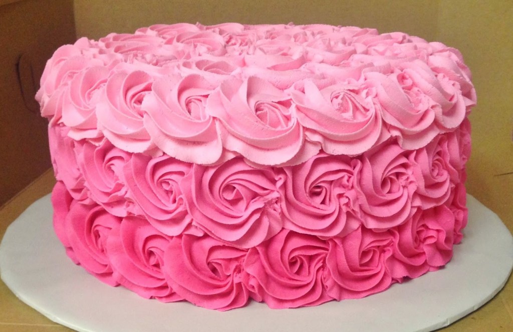 Top with the cake layer that was left plain. Trim the crown as before. Spread a crumb layer of frosting over the sides beginning at the bottom with the deepest color and gradually work toward the top with lighter and lighter shades of pink. The transition in color will serve as a guide when piping the rosettes as well as to hide any small gaps.