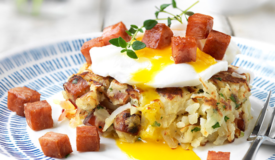 Melt half of the butter over a medium heat. Place a mold ring in the skillet. Pack with potato mixture. Repeat to create four potato-SPAM rounds. Cover and cook until golden, about 6 minutes. Gently flip round, continue to cook another 5 minutes. Transfer to platter, keep warm.