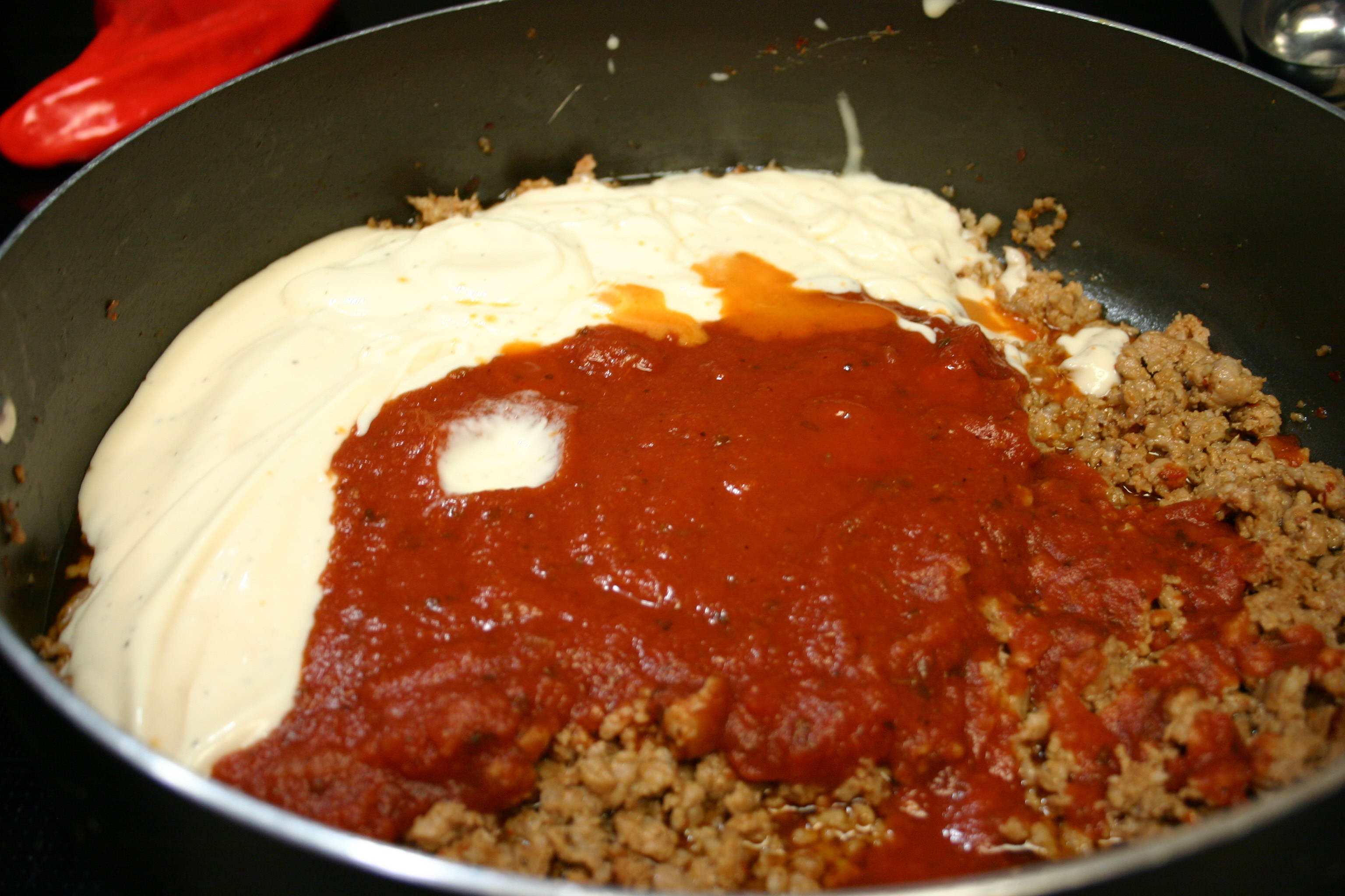 But what if you didn’t have to choose. We’ve done this before, with a different pasta and meat. And we’re doing it again, with a bit more heat. The Alfredo Sauce stands up nicely to both the Hot Italian Sausage and the Tomato Pasta Sauce. It brings a creamy, silky goodness to the plate. Think along the lines of a Bolognese sauce. That same silky goodness made by simply combining a tomato sauce with an Alfredo Sauce.