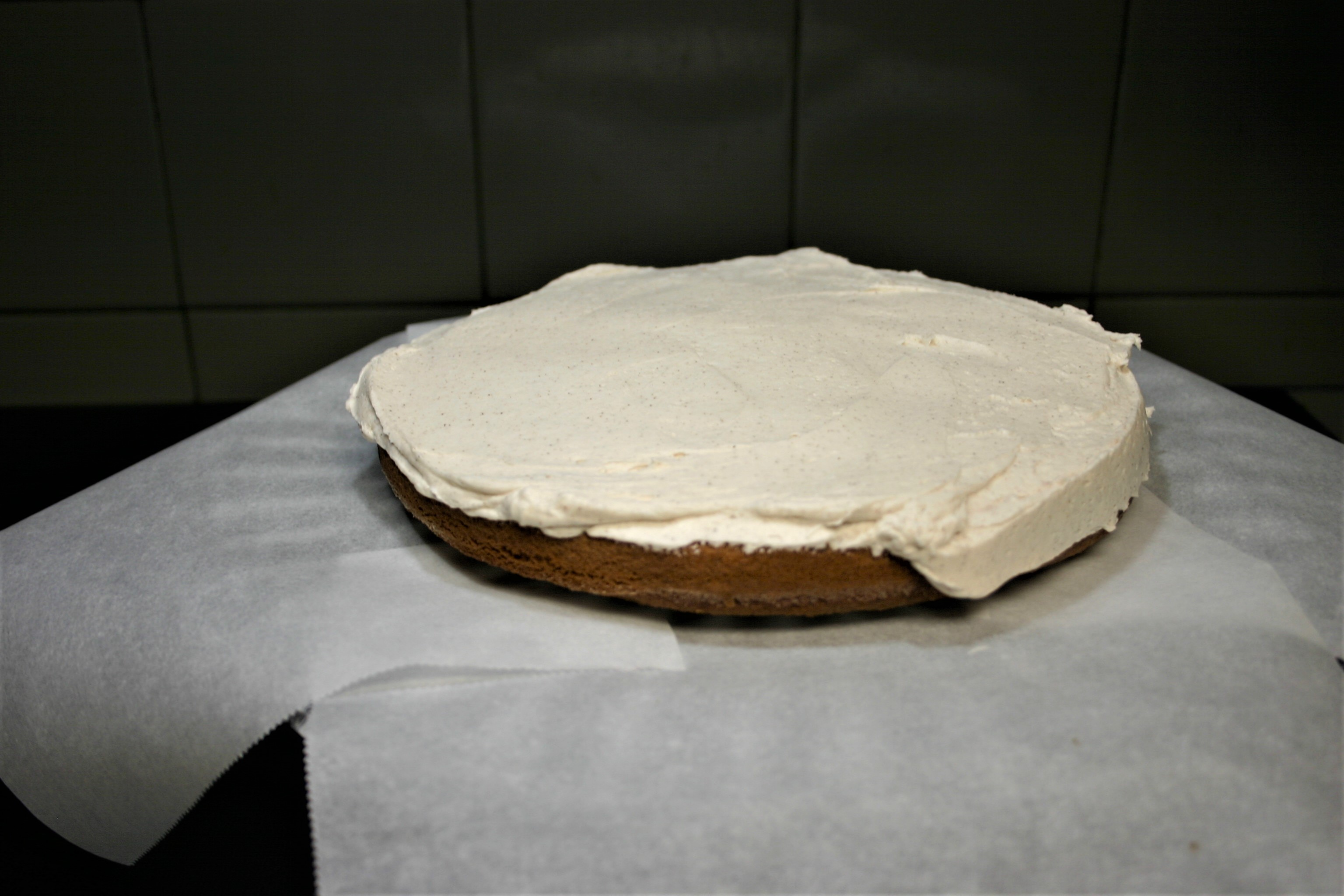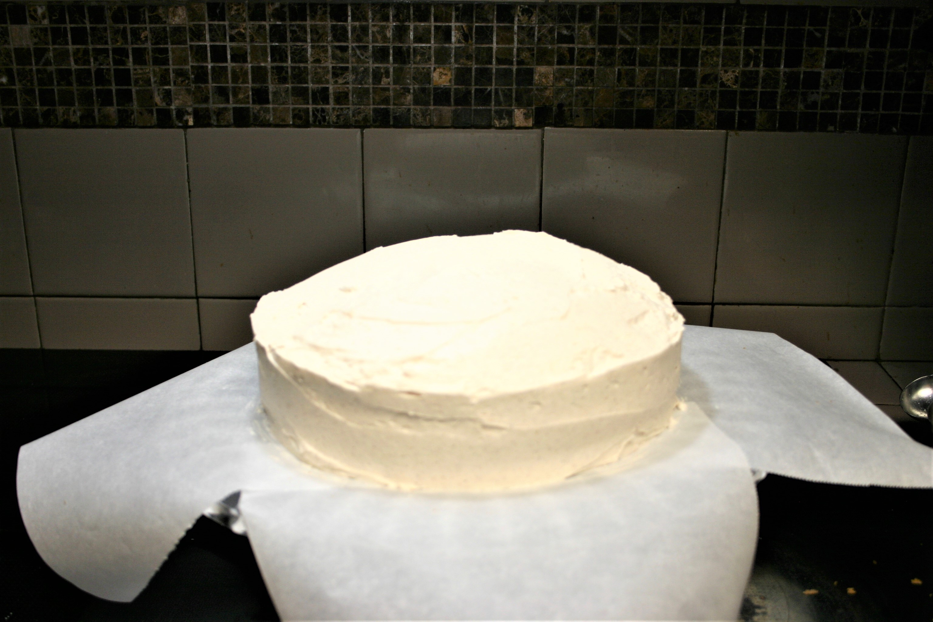 Frost top and side of first cake layer. Top with second cake. Frost top and sides of second layer. Frost sides for a seamless appearance.