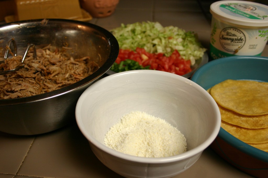 While the pork cooks, shred lettuce, dice tomatoes and chop cilantro. Lay in a plate, cover and refrigerate until ready to use.