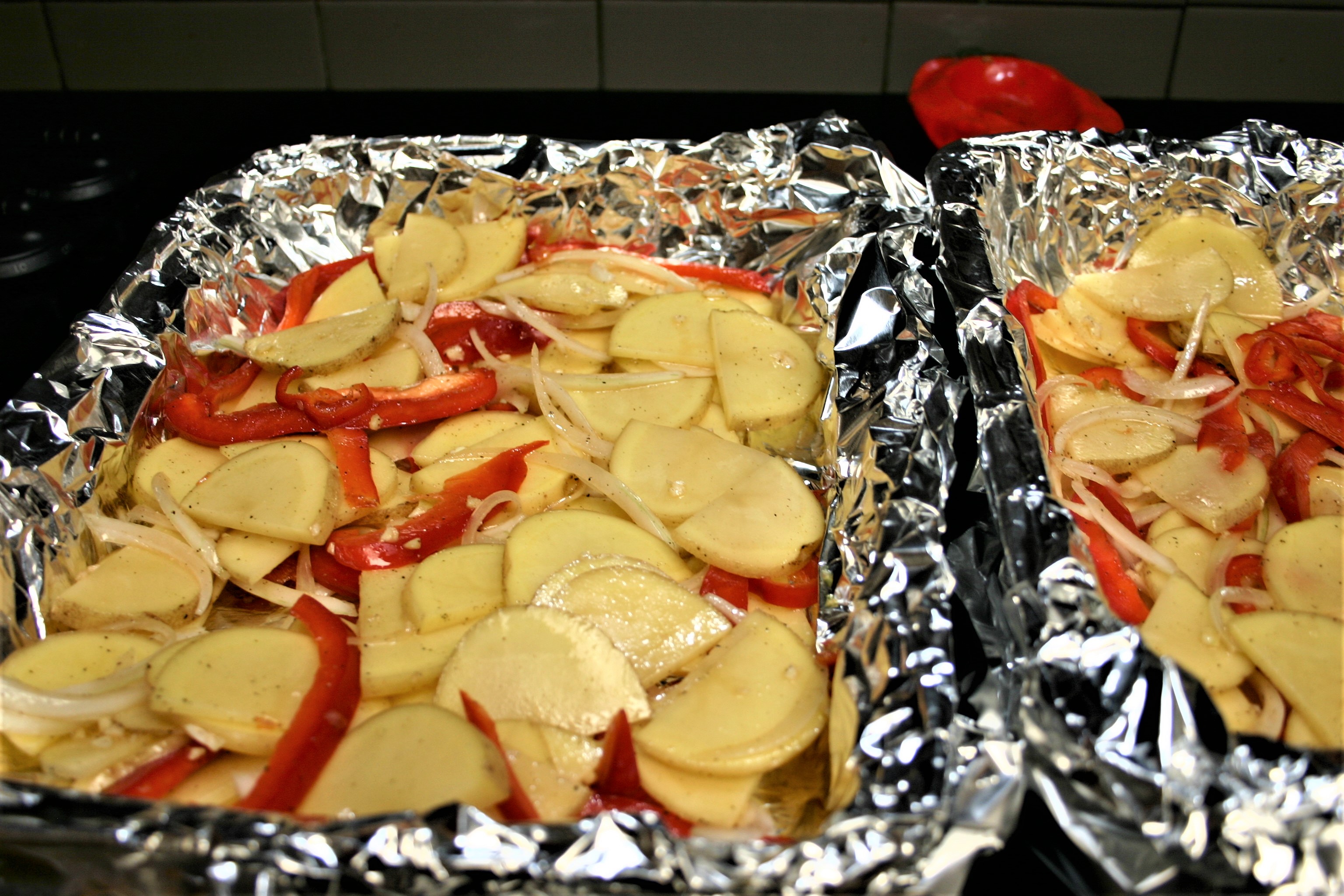 Core, seed and thinly slice bell pepper. Add to the potatoes. Cut onions in half from root to tip. Peel and slice into thin slivers. Add to the potato mixture. Set aside.