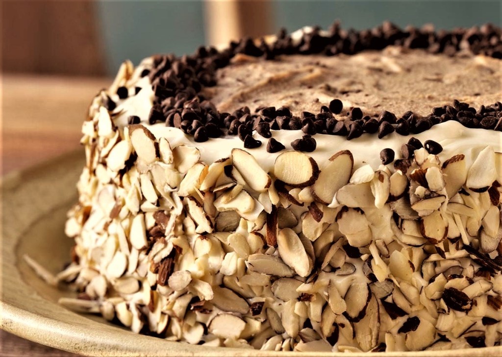 Press almonds into sides of cake. Sprinkle chocolate chips over top between the filling and the frosting. Refrigerate until serving.