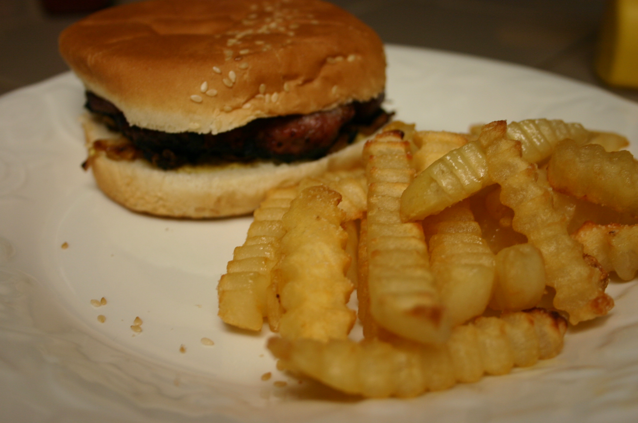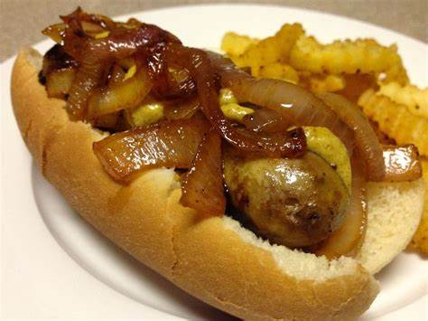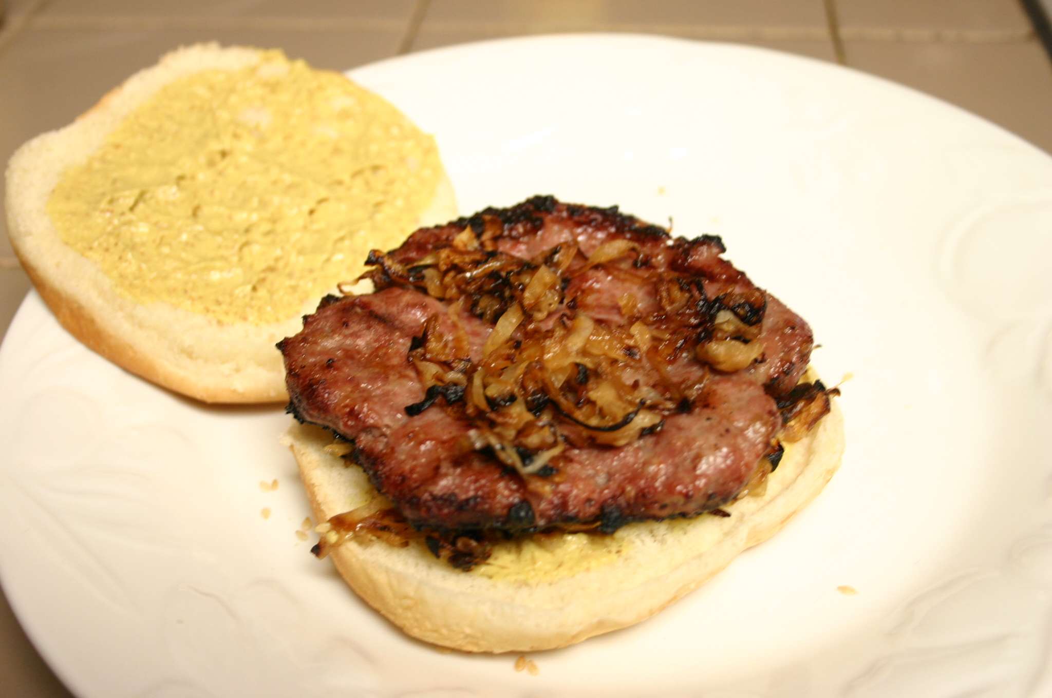 While the brat burgers grill, split buns. Spread mustard on the cut side of both top and bottom bun. Place some grilled onions on each bottom bun. Top onion with a brat burger, top burger with more grilled onion. Place top bun to complete, serve with fries and enjoy.