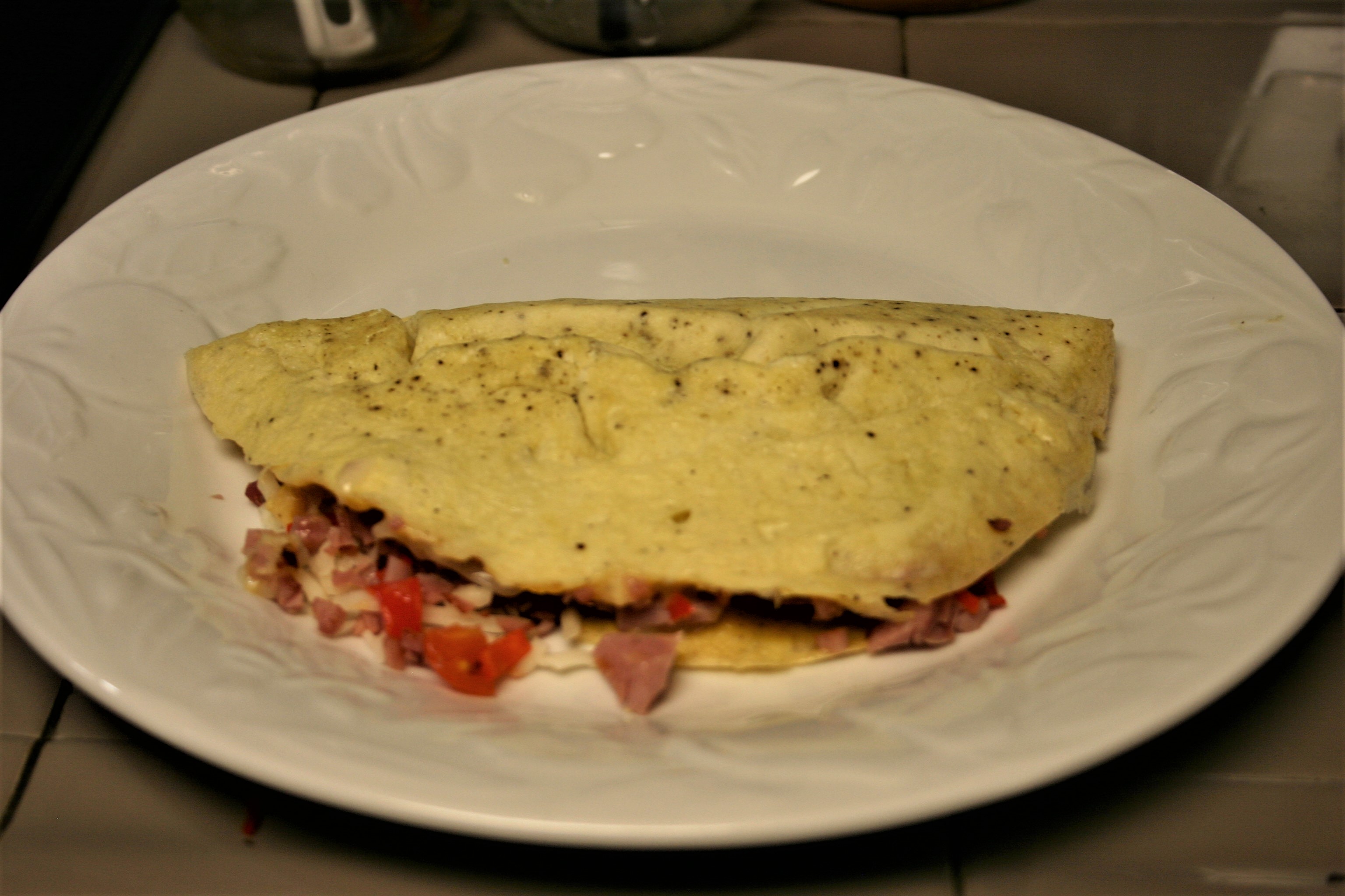 Once omelette is cooked, remove from heat. Fill one side with a quarter of the ham mixture. Add a quarter of the tomatoes and a quarter of the cheese. Fold omelette over the filling. Place a plate over the pan, flip omelette out and serve.