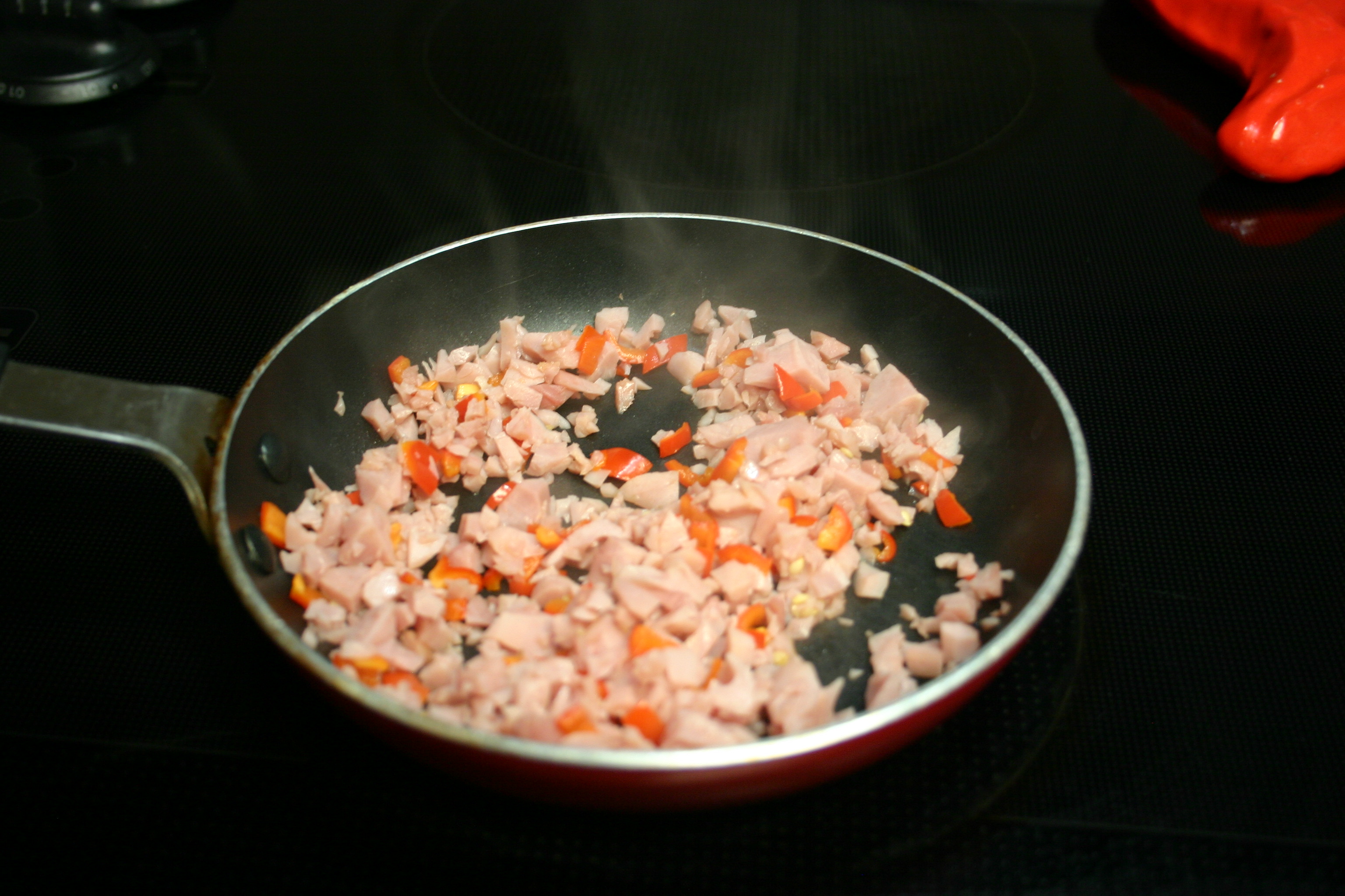 Heat a small dry skillet over medium heat. Add ham and peppers. Sauté together, keep warm.