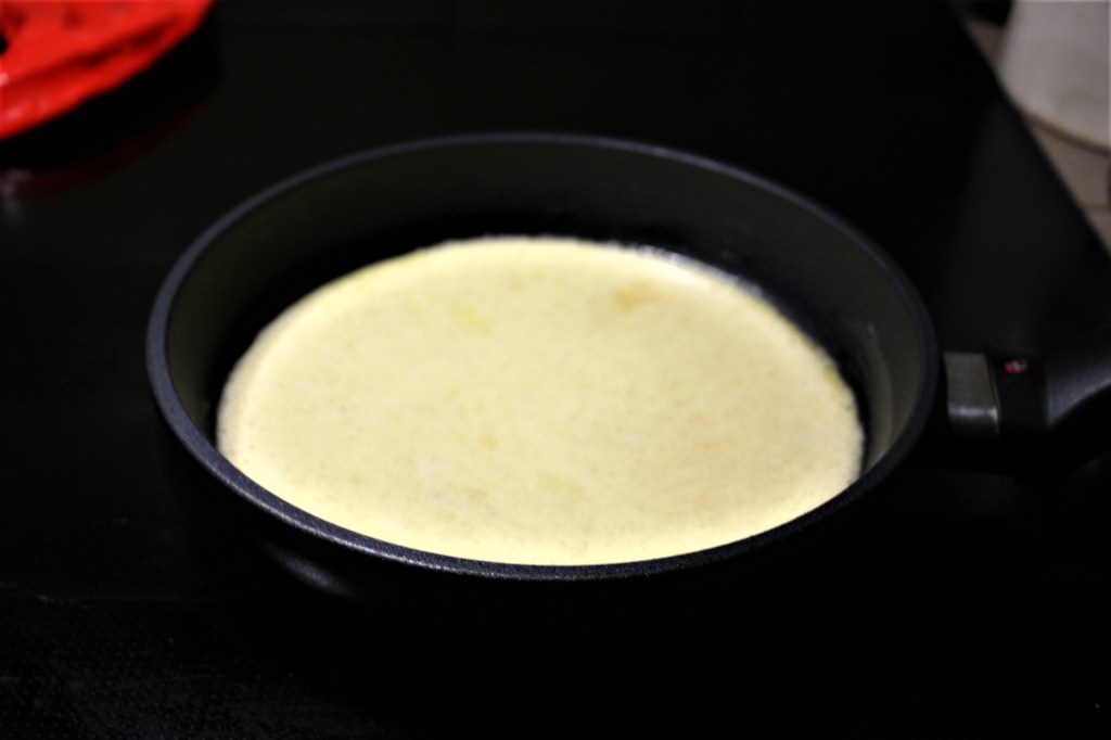 Warm a small sauté pan or omelette pan over medium-low heat. Lightly butter pan. Pour egg mixture into the skillet. Let cook until eggs just begin to set. Shake pan, pushing edges toward the center, allowing uncooked eggs to seep underneath and continue to cook.