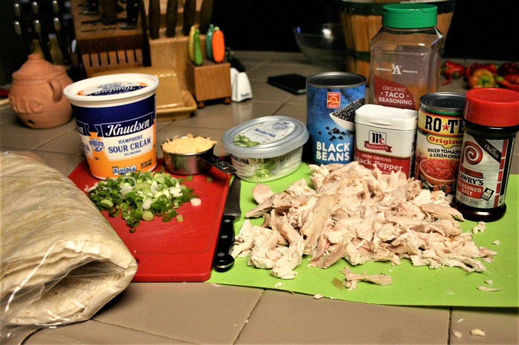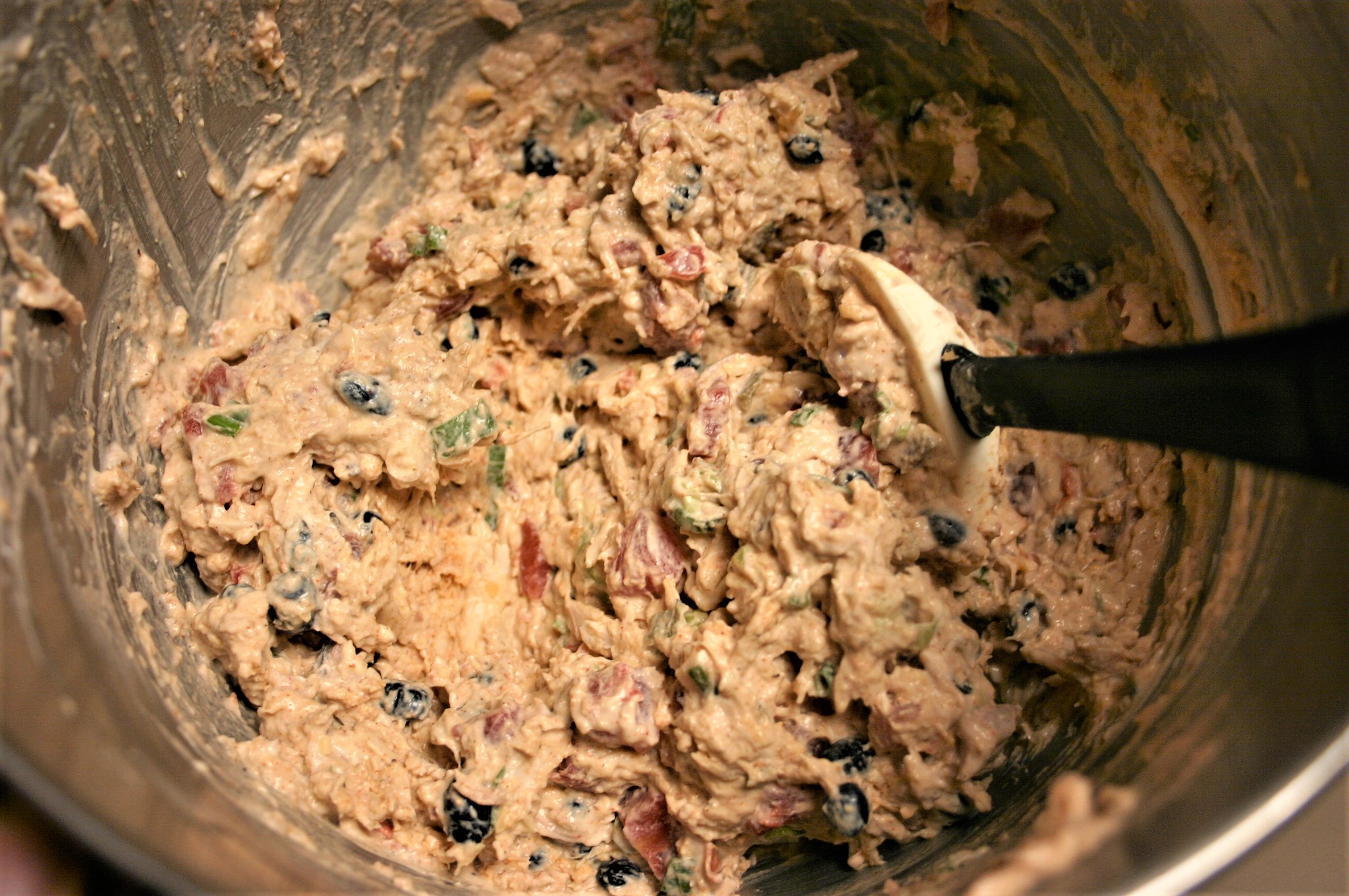 Rinse and drain black beans, fold into the cream cheese mixture. Add shredded chicken and green onions