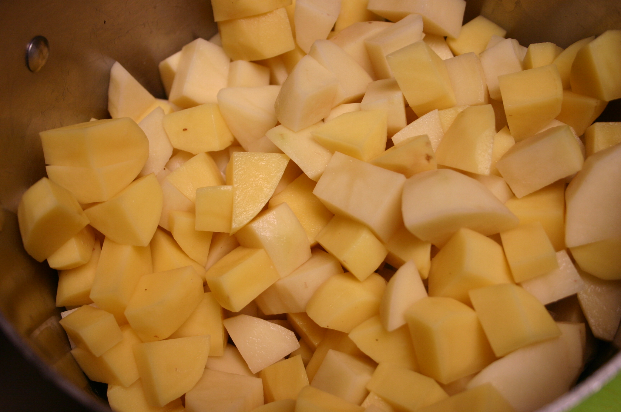 Peel and cut potatoes into 1 1/2-inch cubes. Place in a 3-quart saucepan and cover with 1 inch of water. Bring to a boil, cover, reduce heat, and simmer until fork tender.