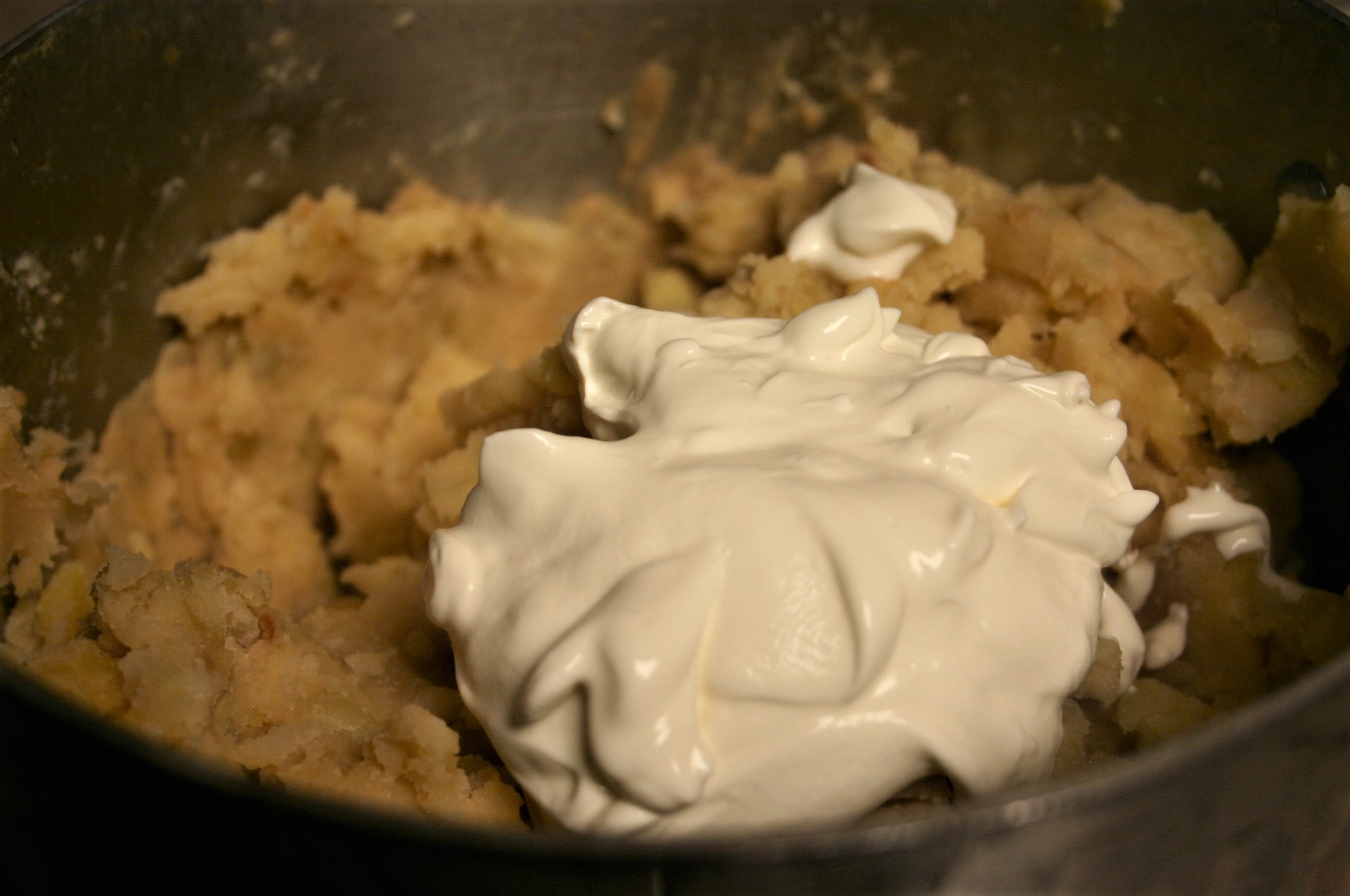 Pour milk and soup mixture over potatoes and mash until fairly smooth. Stir in sour cream. Finish with soft butter and a generous amount of black pepper.