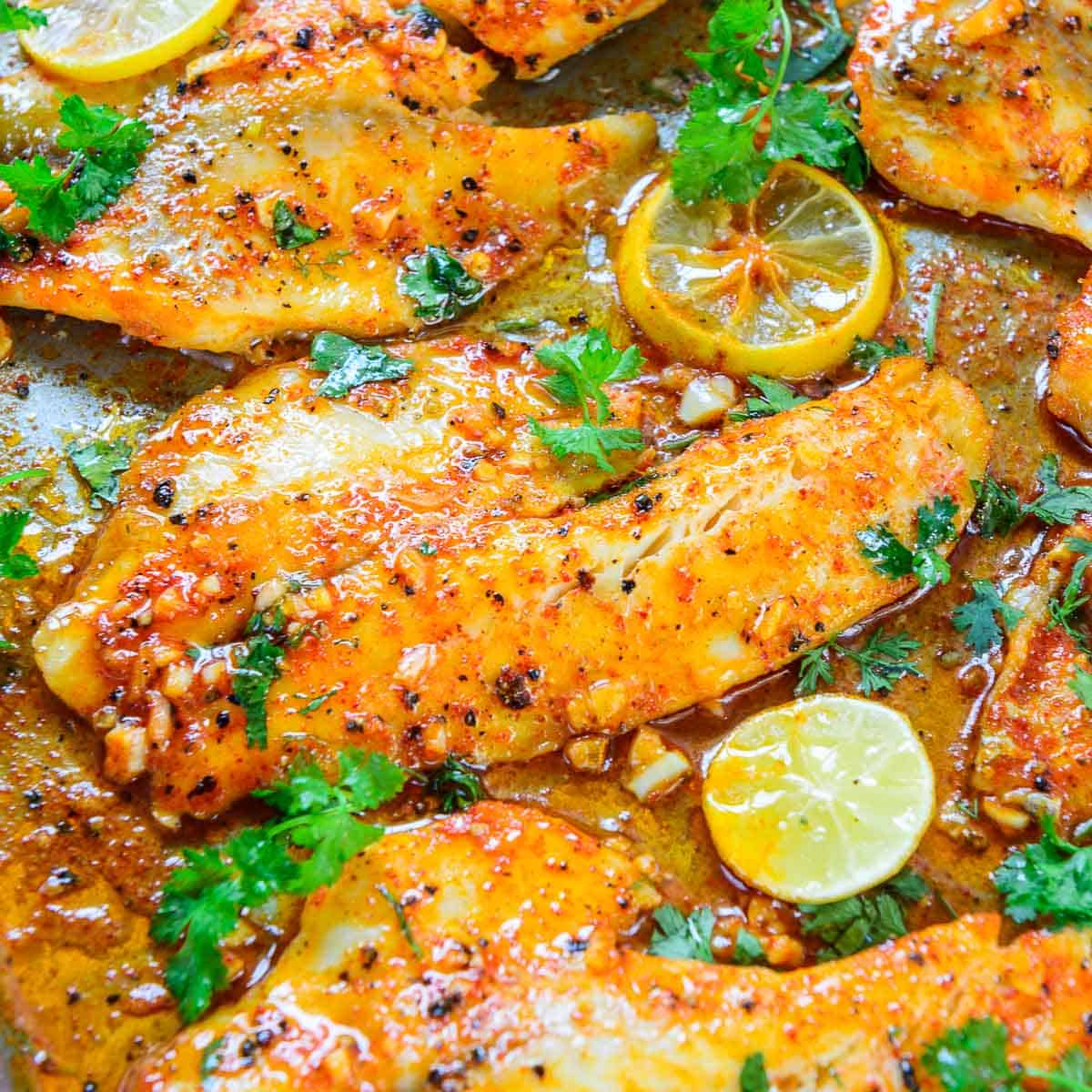 Heat oven to 350-degrees. Rinse fillets, pat dry. Place fish on a rimmed baking pan, set aside.