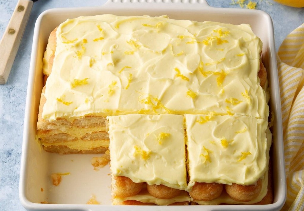 In a shallow bowl, whisk lemon juice and sugar together until the sugar is completely dissolved. Quickly dip 8 ladyfingers into the sweetened lemon juice, allowing excess to drip back into the bowl. Arrange ladyfingers in a single layer in an 8-inch square dish.
