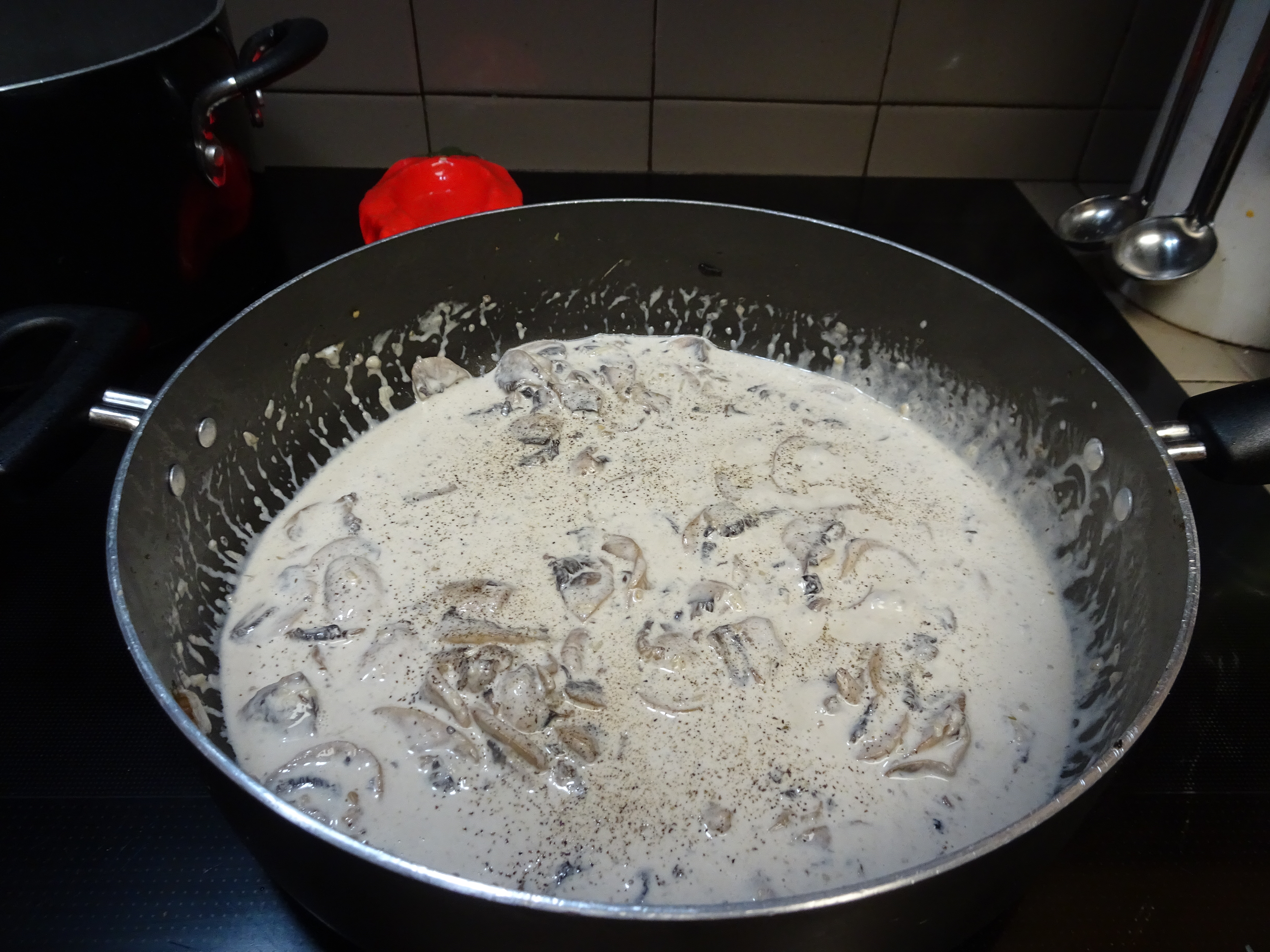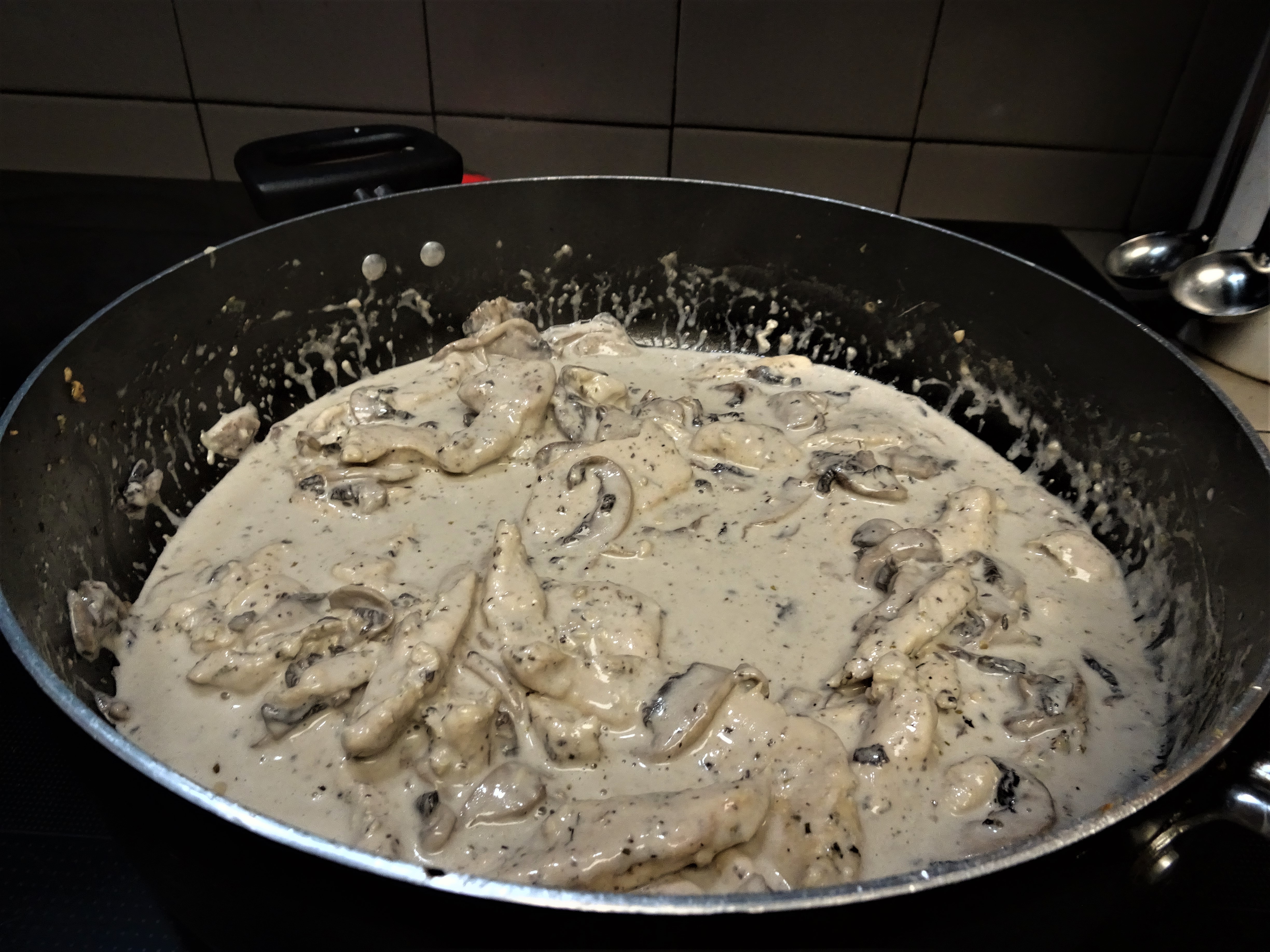 Slowly add cream, bring to a simmer. Return chicken to the pan, cover and let simmer until the pasta is ready.
