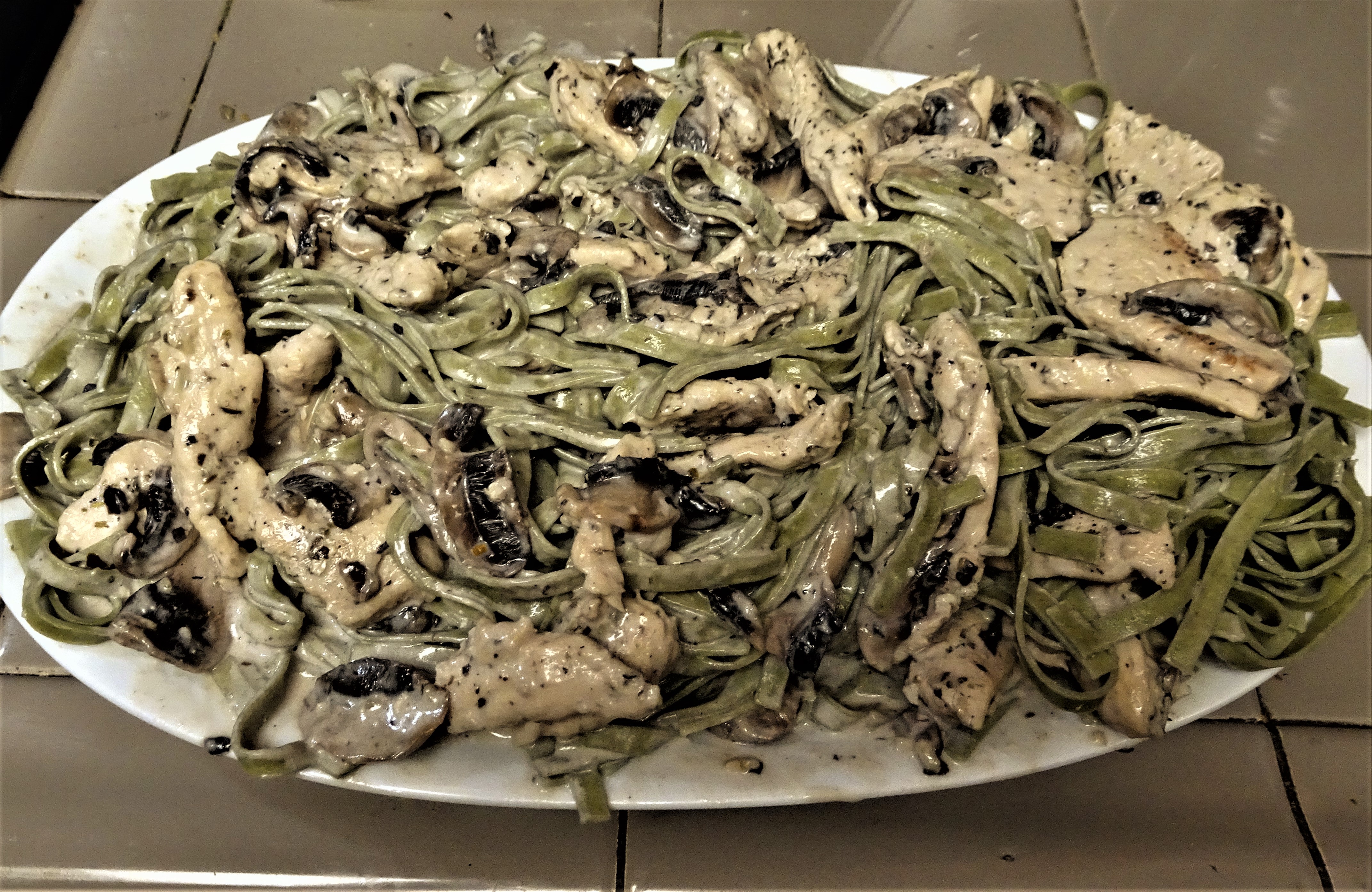 Spread Fettuccine out on a warm serving platter. Add chicken, mushrooms and brandy cream sauce to the pasta. Toss to coat pasta in the sauce.