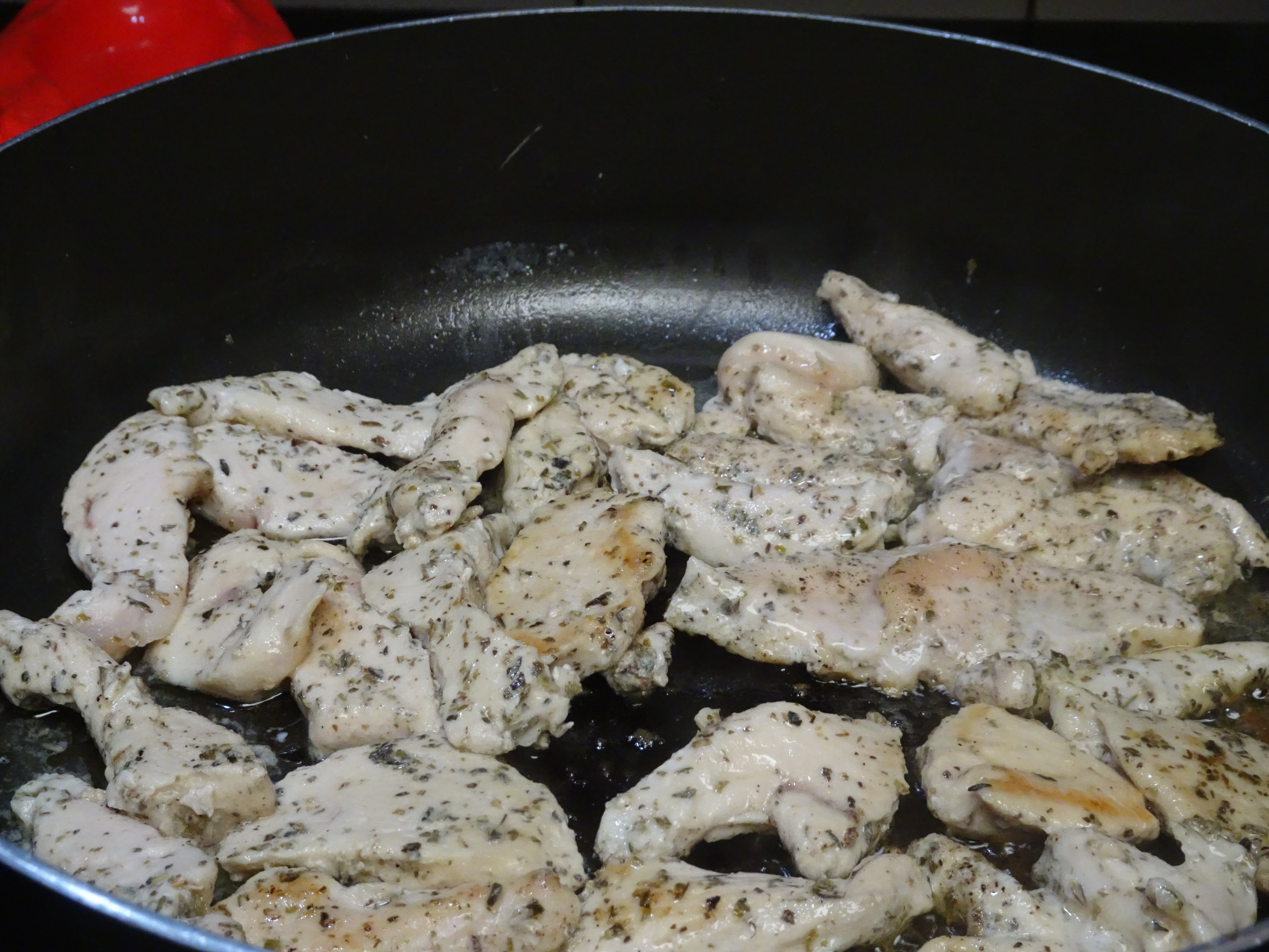 Cut each chicken breast in half widthwise. Cut each half into strips. Lay chicken out on the cutting board. Sprinkle with garlic power and Italian Seasoning. Toss to coat an set aside.