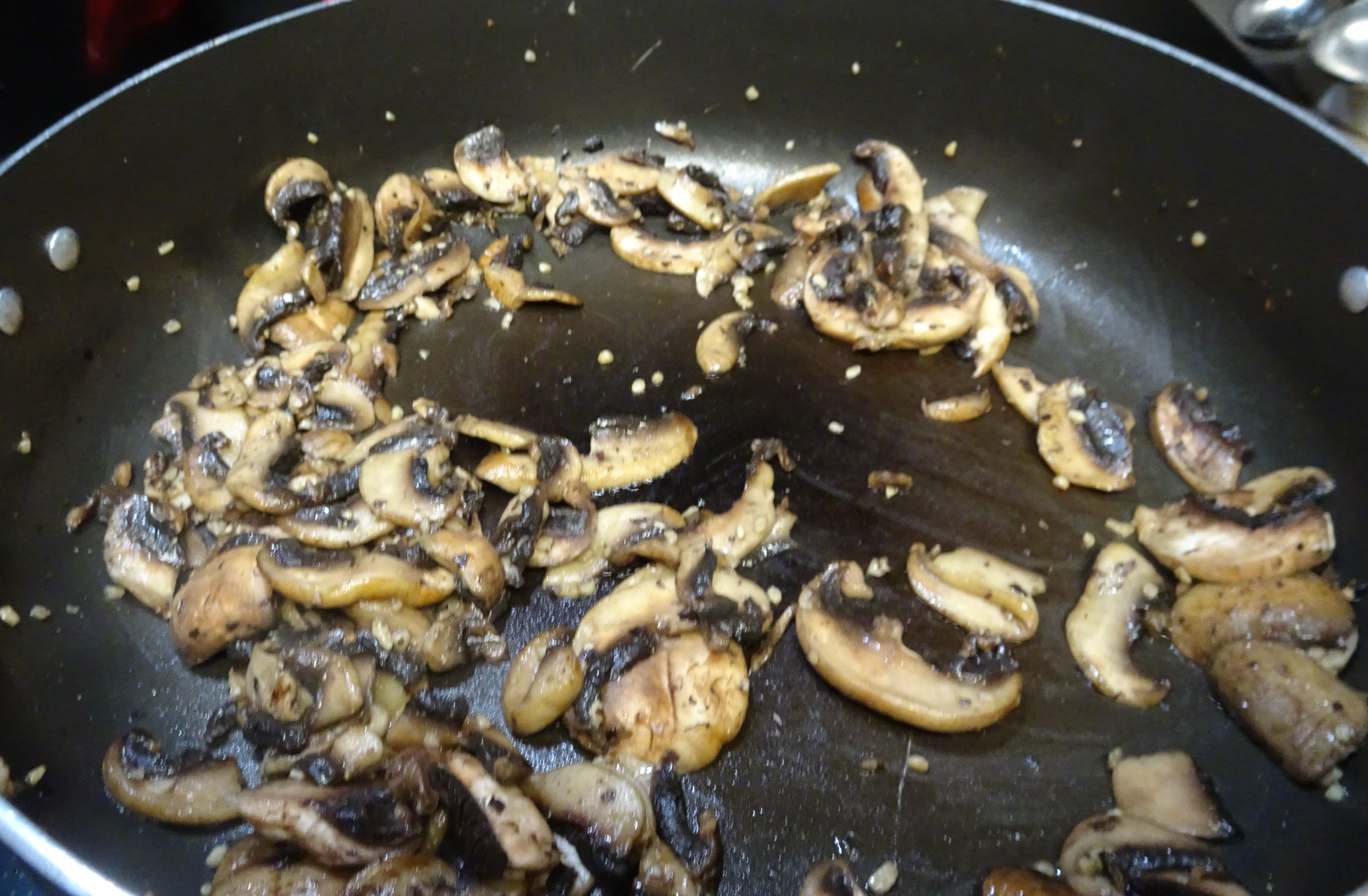 Add remaining 2 tablespoons of butter to the skillet, swirl to coat. Add mushrooms to the pan, sauté until mushrooms are tender and most of their liquid has been released. Add garlic to the pan, cook for about a minute more.