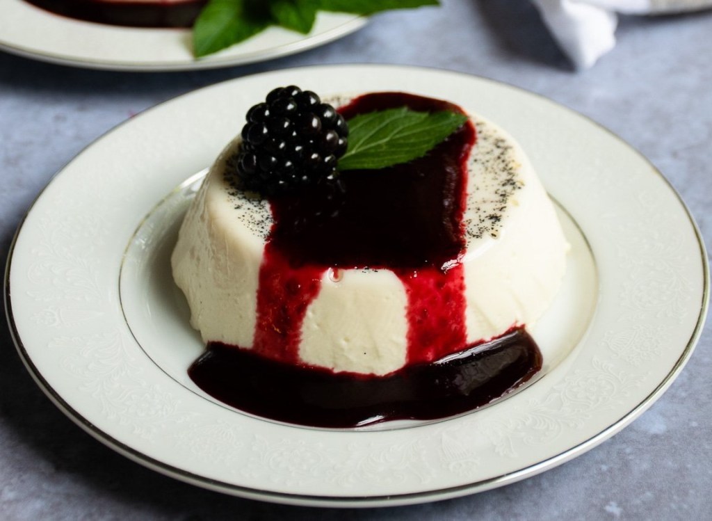 Spoon some of the sauce around the plates and over the Panna Cotta. Garnish each dessert with a blackberry and some mint leaves. Serve and enjoy.
