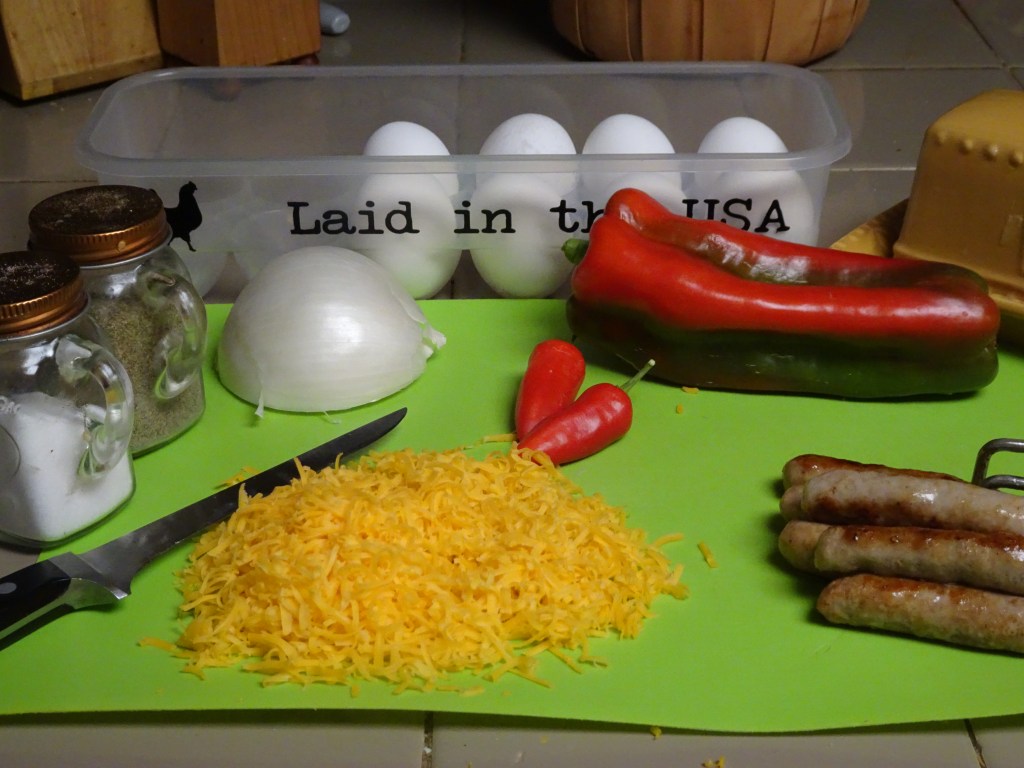 Pour eggs over the onions. Add the peppers and sausage. Carefully mix everything without causing the eggs to “scramble”. Season with salt and pepper.